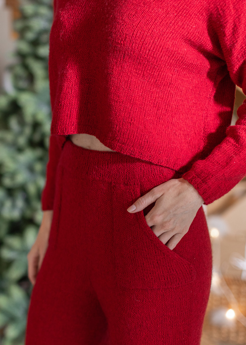 The pants are knitted seamlessly from top down. Pockets are knitted seperately and are sewn on. The pants have an inseam length (measured hanging) of 82 (81 - 80 - 79 - 78 - 77), a waist circumference of 62 (70 - 78 - 86 - 98 - 110) cm, a thigh circumference 56 (61 - 66 - 71- 78 - 85) cm of and a hip circumference of 86 (94 - 102 - 110 - 122 - 134) cm.