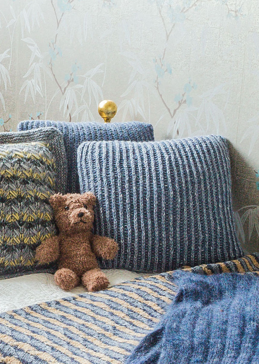 100 g of Lana Grossa Alta Moda Alpaca (90% baby alpaca, 5% Merino wool, 5% polyamide; 140 m/50 g) in Grey-Blue Melange (col 60) and 100 g of Lana Grossa Cometa (34% baby alpaca, 33% polyamide, 22% viscose, 6% Merino wool, 5% polyester; 130 m/50 g) in Grey-Blue/Silver (col 10). Size 7 mm circular needle, 60 cm long; 45 x 45 cm pillow form