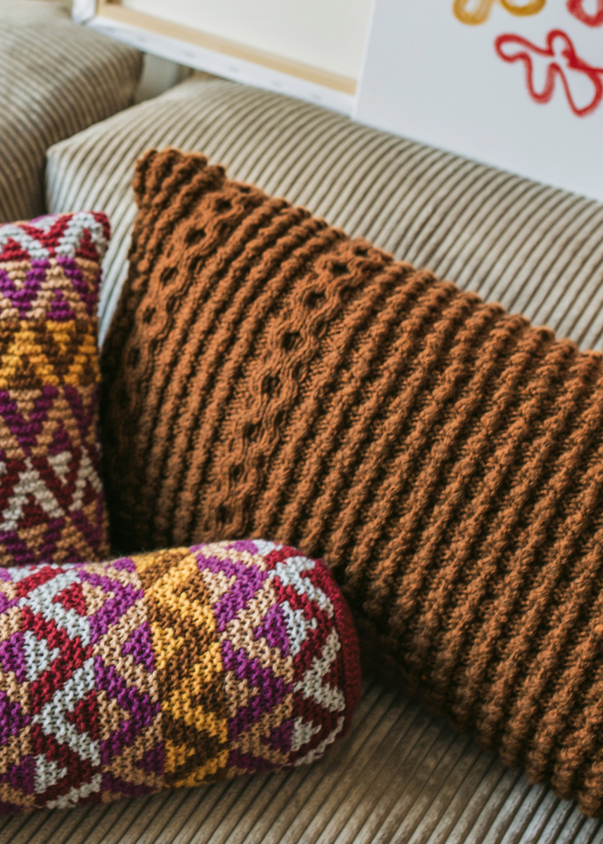 Lana Grossa quality "Alta Moda Cashmere 16" (78 % Virgin wool (merino), 12% cashmere, 10% polyamide, rl = approx. 110 m / 50 g): approx. 800 g brown (color 42); No. 7 knitting needles; 1 cable needle; 1 washable pillow inlay 40 x 140 cm