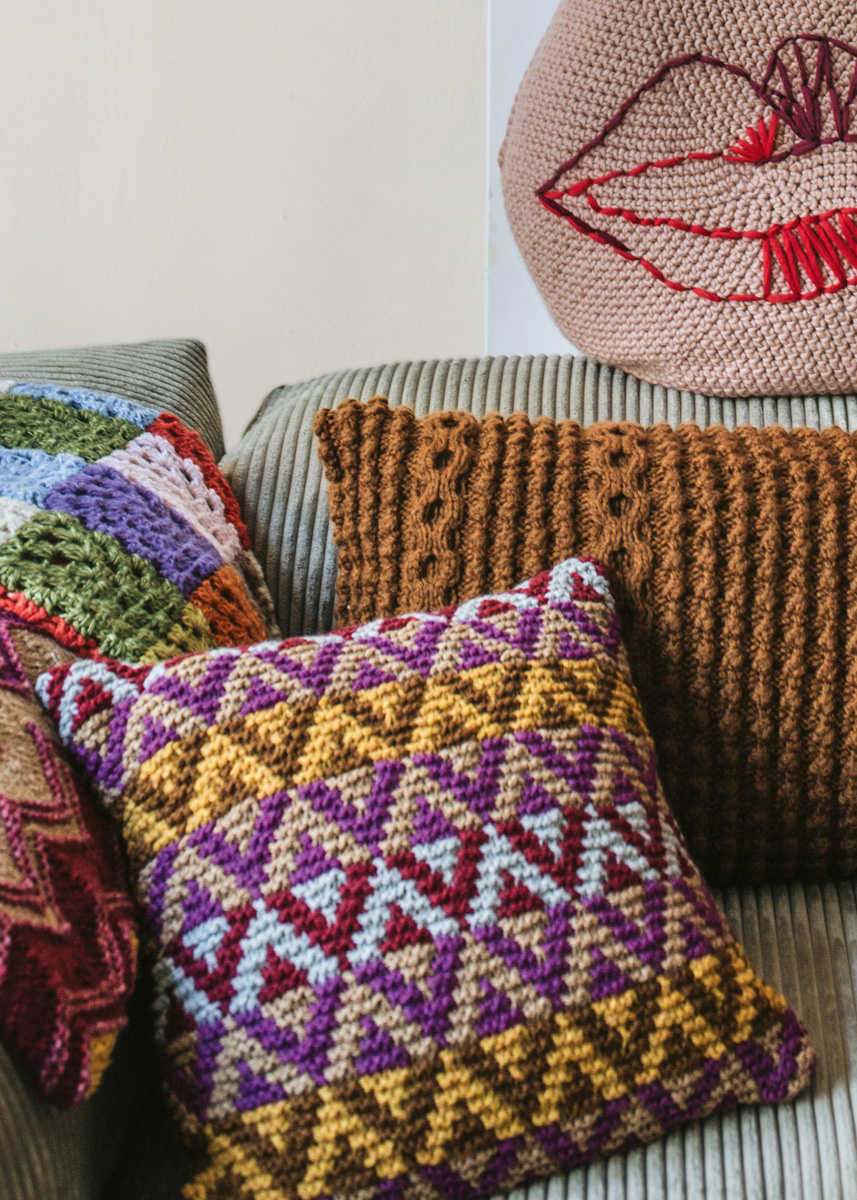 100 g each of Lana Grossa Cool Merino (90% Merino wool, 10% polyamide; 150 m/50 g) in Camel (col 11) and Fuchsia (col 2), 50 g each in Dark Red (col 1), Gold (col 8), Nougat (col 9) and Light Grey (col 13). Size 6 mm needles; one 40 x 40 pillow form