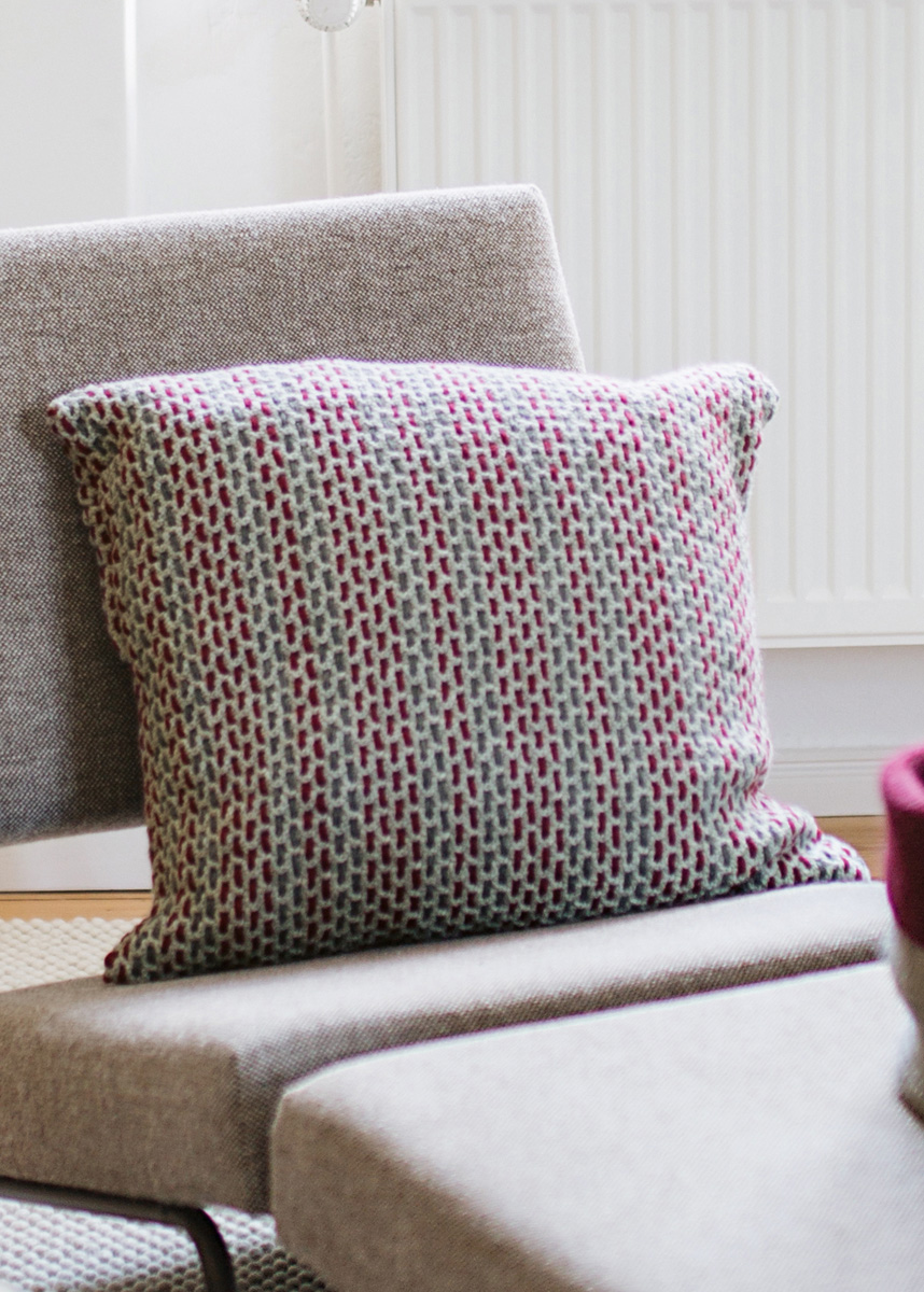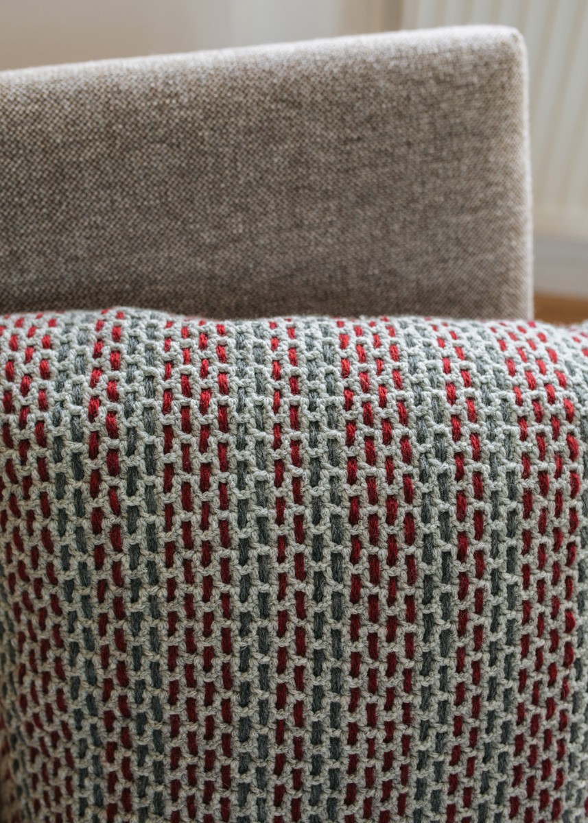 300 g of Lana Grossa Cool Merino (90% Merino wool, 10% polyamide; 150 m/50 g) in Light Grey (col 13) and 50 g each in Dark Red (col 1) and Dark Grey (col 12). Size 4 mm crochet hook; tapestry needle; one 50 x 50 pillow form