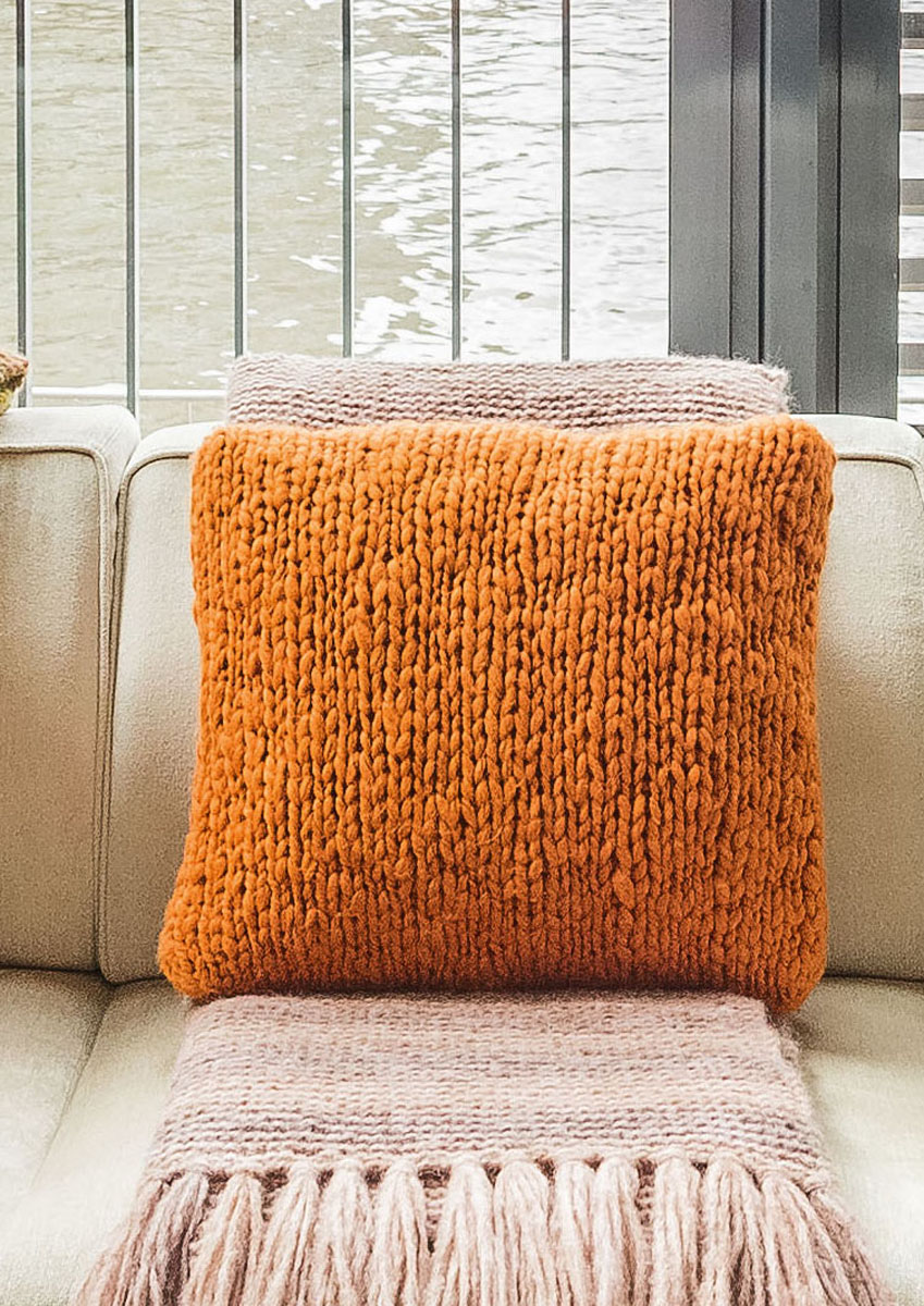 500 g each of Lana Grossa Estremo (60% Merino wool, 40% acrylic; 41 m/100 g) in Terracotta (col 5) and Moss (col 10). Size 15 mm needles; two 45 x 45 cm pillow forms