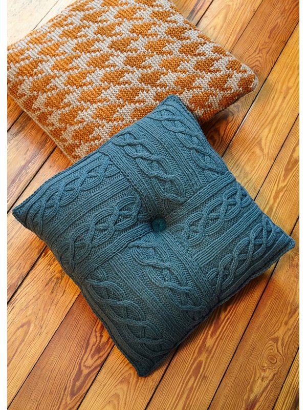 550 g of Lana Grossa Mille II (50% extrafine Merino wool, 50% acrylic; 55 m/50 g) in Blue Green (col 91); 50 g of Lana Grossa Ecopuno (72% cotton, 17% Merino wool, 11% baby alpaca; 215 m/50 g) in Dark Petrol (col 37). Size 6 mm needles; 2 cable needles [cn]; size 5 mm crochet hook; tapestry needle; sewing needle; washable pillow form, 60 x 60 cm; one 36 mm transparent “Creativ-Knopf” by Prym, item 312103