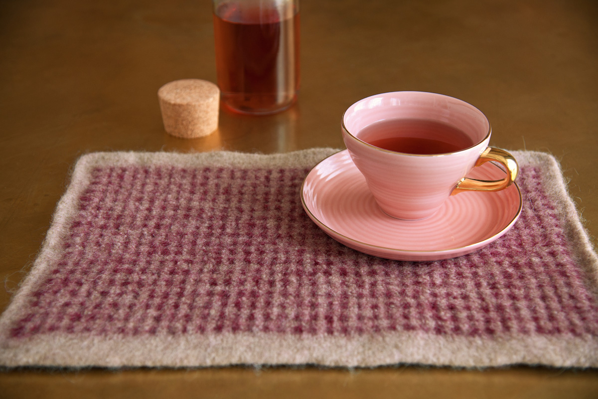 150 g of Lana Grossa Feltro Fine (100% wool; 100 m/50 g) in Beige (col 13) and 100 g in Wine (col 6). Size 5 mm circular needle, 80 cm long