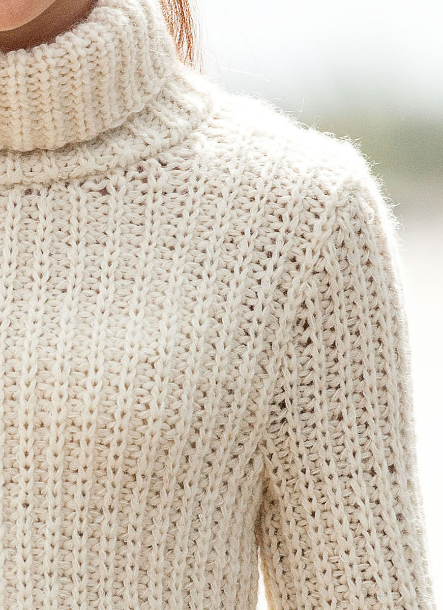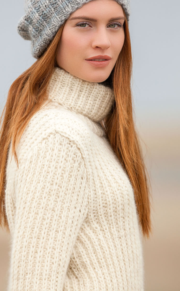 550 (600, 650) g of Lana Grossa Colmo (55% Merino wool, 25% baby alpaca, 20% superkid mohair; 120 m/50 g) in Natural (col 1) and 150 (175, 200) g of Lana Grossa Silkhair Paillettes (61% mohair, 17% polyamide, 11% silk, 11% wool; 155 m/25 g) in Ecru (col 415). Size 8 mm needles; size 8 mm circular needle, 40 cm long.