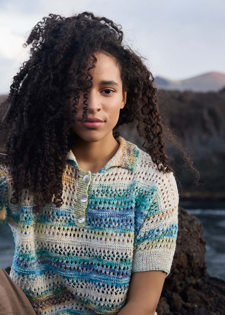 300 (400, 400, 400, 500) g of Lana Grossa Gomitolo Hippie (66% cotton, 30% hemp, 4% linen; 300 m/100 g) in Blue Purple/Turquoise/Natural/Moss Green/ Ochre/Dark Grey/Linden Green (col 3033). Size 2.5 and 3 mm needles; short size 2.5 mm circular needle; three 17 mm mother-of-pearl buttons.