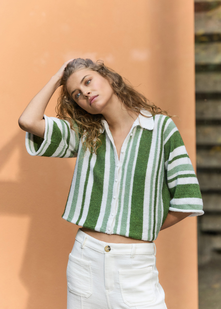 Materials: 150 (200, 200, 250) g of Lana Grossa Ecopuno (72% cotton, 17% Merino wool, 11% baby alpaca; 215 m/50 g) in White (col 26), 100 (150, 150, 200) g in Grass Green (col 221) and 50 (100, 100, 100) g in Pear Green (col 225). Size 3 and 3.5 mm needles; short size 3 and 3.5 mm circular needles; size 3.5 mm crochet hook; seven 10 mm