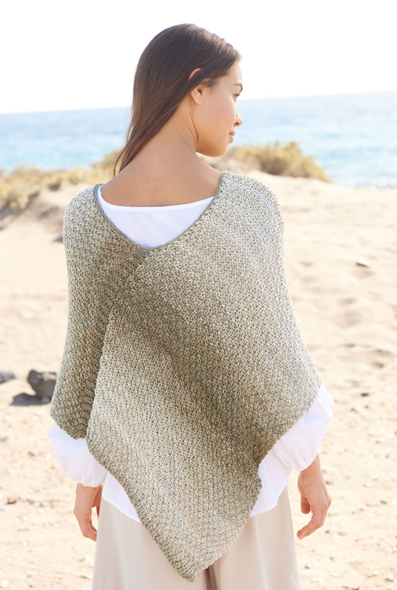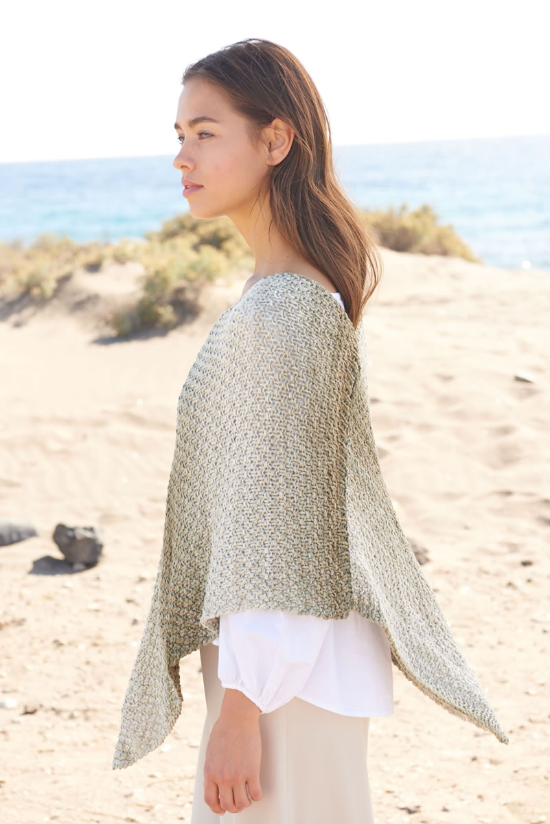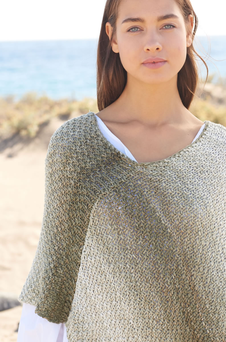 500 (600, 700) g of Lana Grossa Allegro Dégradé (58% viscose, 42% cotton; 230 m/100 g) in Natural/Green-Beige/Straw-/Moss-Green/Olive-Brown (col 208). Size 8 mm needles; size 6 mm crochet hook.