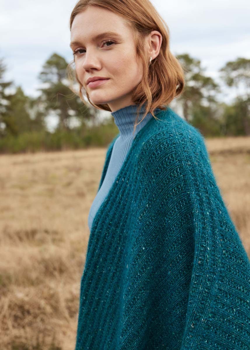 350 g of Lana Grossa Cashmere 16 Fine (80% Merino wool, 10% cashmere, 10% polyamide; 320 m/50 g) in Deep Sea Green (col 66) and 250 g of Lana Grossa Natural Superkid Tweed (60% superkid mohair, 30% silk, 7% cotton, 3% polyester; 200 m/25 g) in Deep Sea Green (col 634). Size 4.5 mm circular needle, 120 cm long.