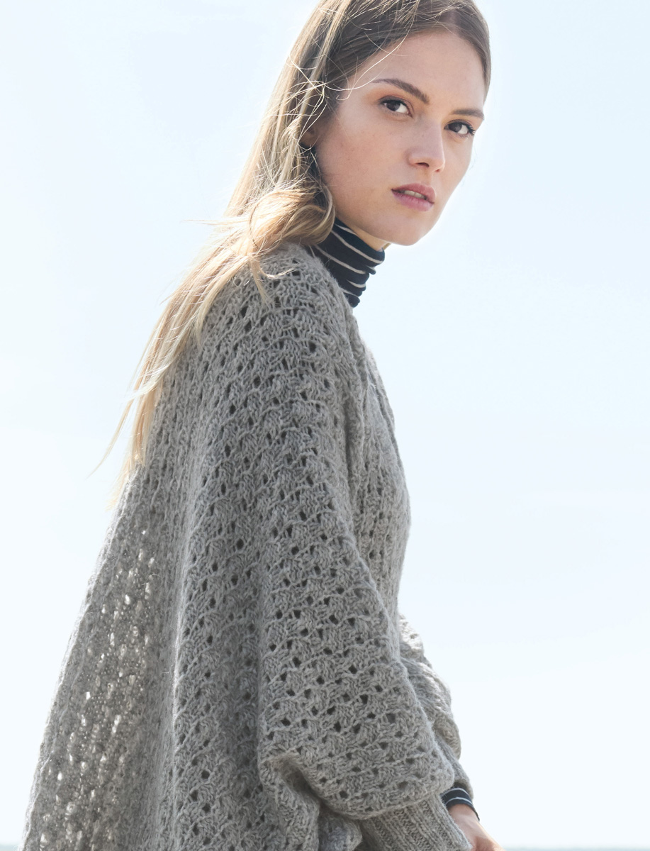 400 g of Lana Grossa Cool Air Fine (50% Merino wool, 28% baby alpaca, 22% acrylic; 240 m/50 g) in Grey/ Natural (col 12). Size 5 mm circular needle, 120 cm long; size 4.5 mm circular needle, 60 cm long