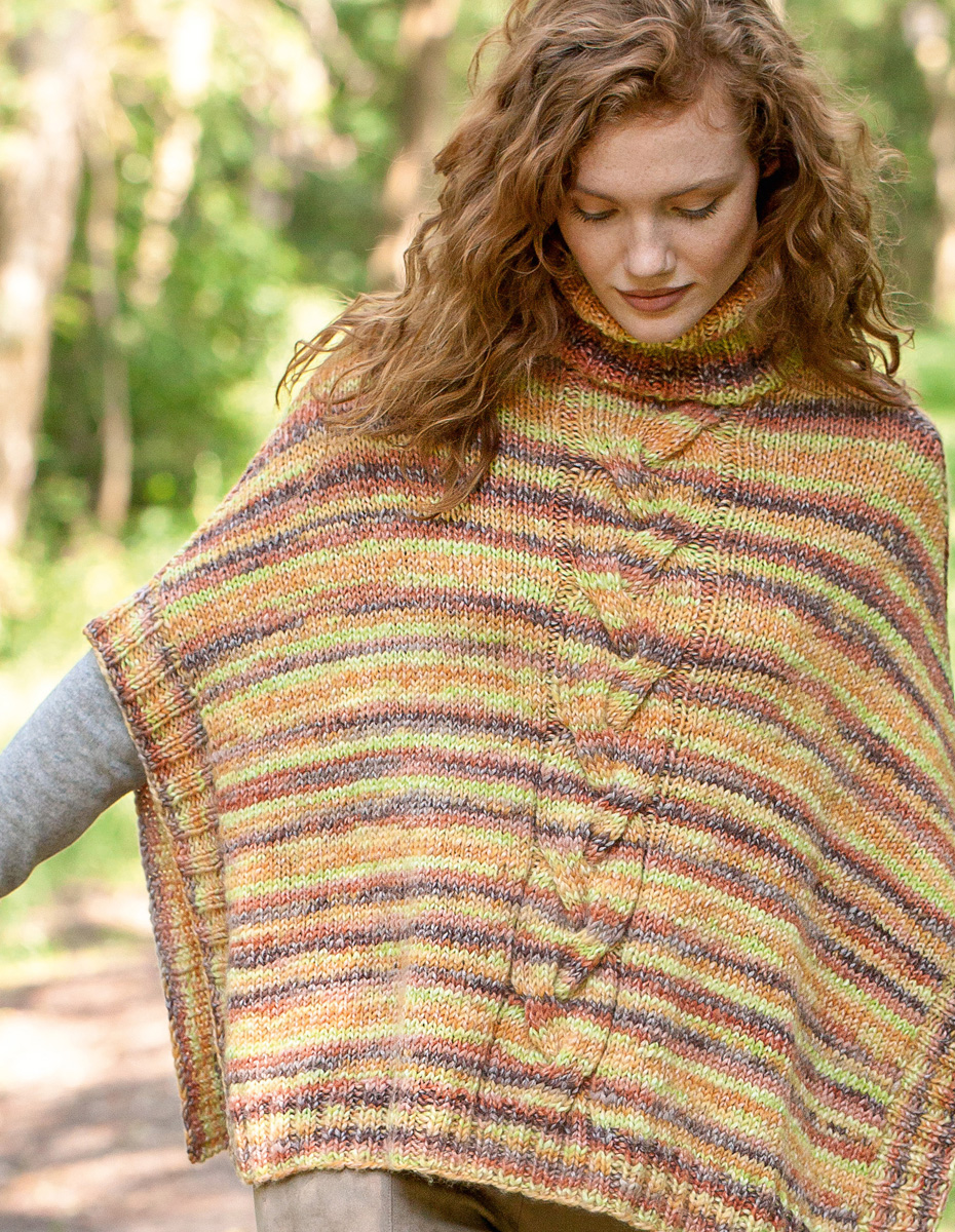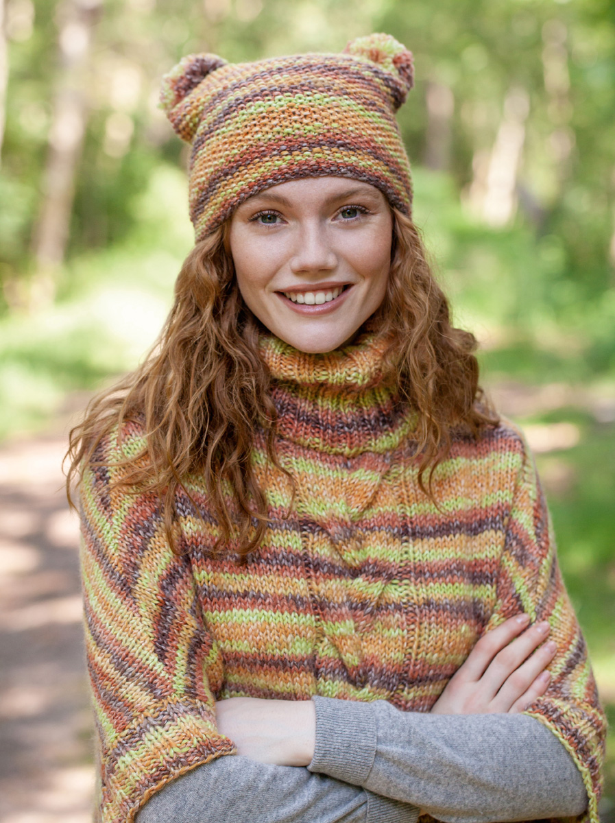 400 (500, 500) g of Lana Grossa Gomitolo Conseta (70% Merino wool, 20% viscose, 10% silk; 200 m/100 g) in Brown-Orange/Lime/Rosewood/Gold (col 704). Size 6 and 7 mm needles; size 6 mm circular needle, 40 cm long; cable needle [cn]