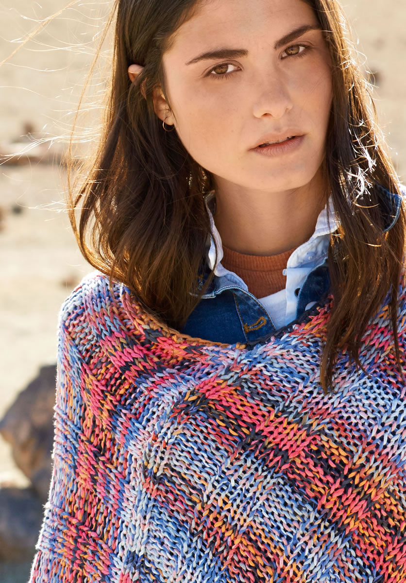 PRACTICAL AND STYLISH. 2 rectangles, a wide 4 x 4 rib pattern and a fun print yarn make up this must-have poncho that can be thrown on over everything