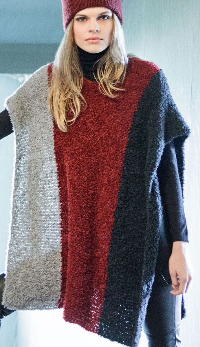 200 (250) g of Lana Grossa Micio (60% Merino wool, 25% polyamide, 15% baby camel; 100 m/50 g) in Dark Red (col 8) and 150 g each in Black (col 12) and Light Grey (col 5). Size 6 mm circular needles, 50 and 80 cm long