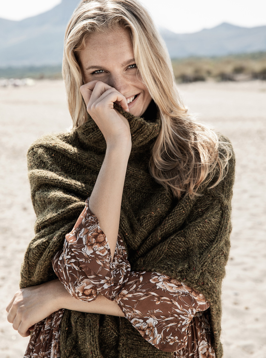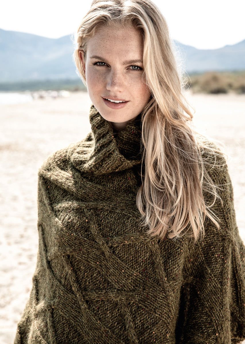 300 g of Lana Grossa Peru Tweed (40% alpaca, 32% viscose, 20% polyamide, 8% pure wool; 175 m/50 g) in Dark Olive (col 10) and 200 g of Lana Grossa Alpaca Peru 200 (100% alpaca; 200 m/50 g) in Olive (col 213). Size 5.5 mm needles; size 5 and 5.5 mm circular needles, each 40 cm long; cable needle [cn]; size 5 mm crochet hook
