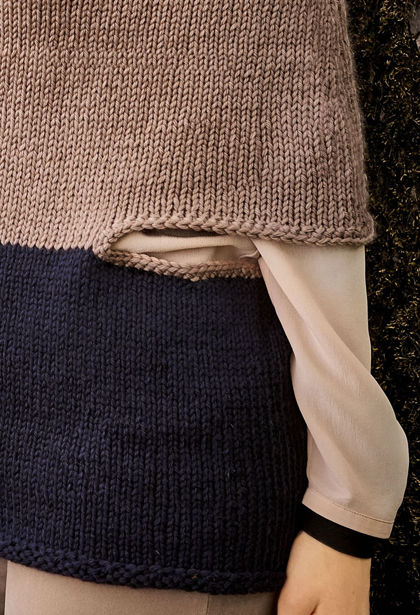 300 (350, 400) g of Lana Grossa Brigitte No. 1 (85 % pure wool, 15% cashmere; 80 m/50 g) in Beige (col 8) and 150 (200, 200) g in Midnight (col 7). Size 6 mm circular needles, 40, 60 and 80 cm long; size 5.5 mm crochet hook.