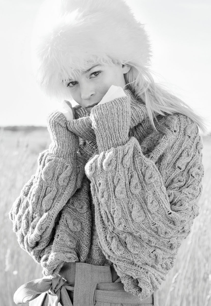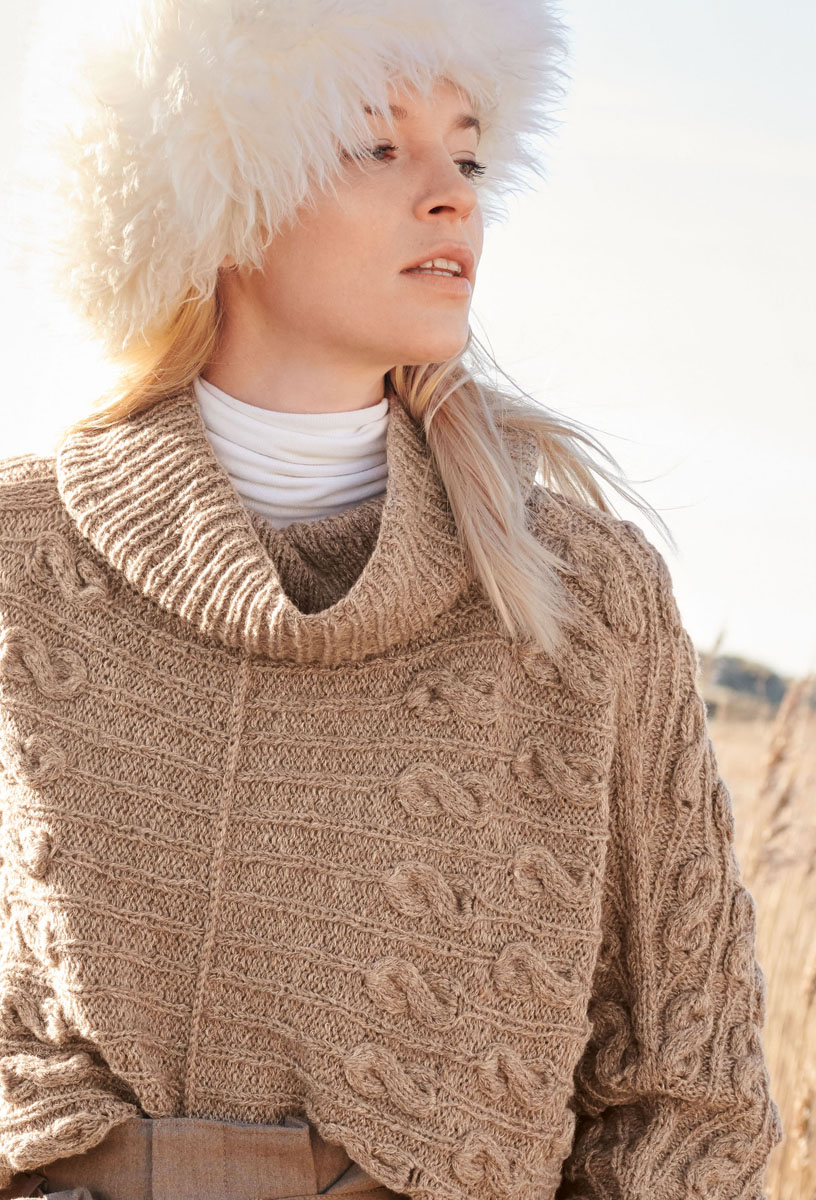 450 (500) g of Lana Grossa Smokey (46% Merino wool, 41% cotton, 8% polyamide, 5% yak; 225 m/50 g) in Linen/Beige/Sand (col 206). Size 4.5 and 5.5 mm needles; size 5.5 mm circular needle, 100 cm long; size 4.5 and 5.5 mm circular needles, each 50 cm long; cable needle [cn]