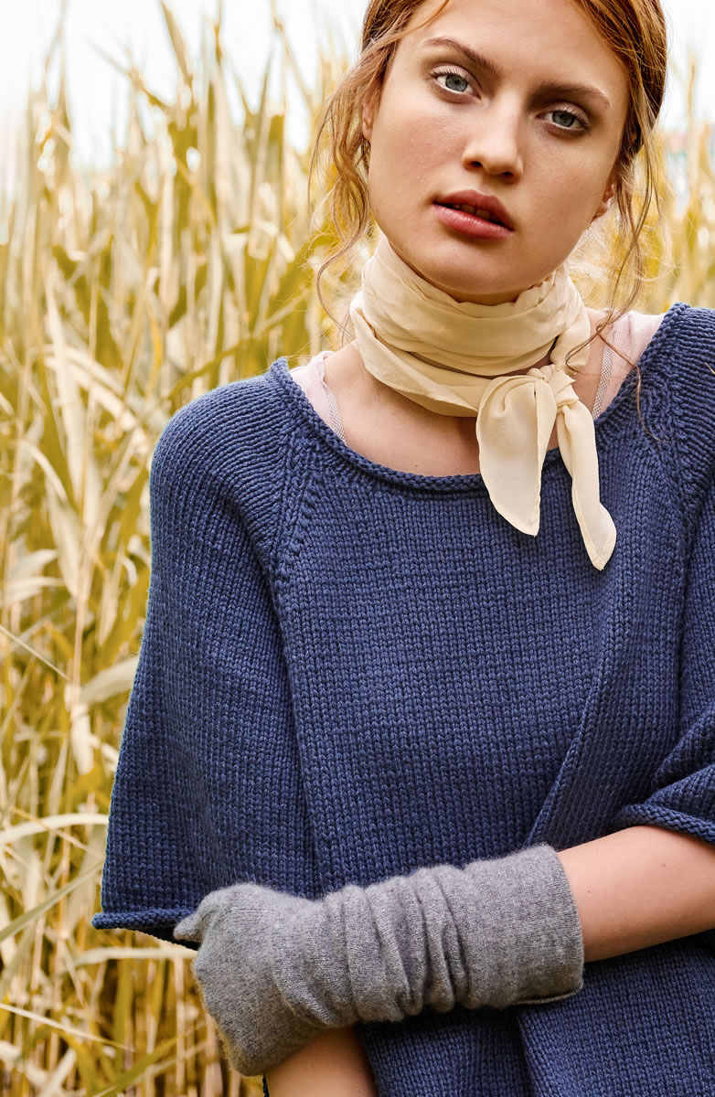 350 (400, 450) g of Lana Grossa 365 Yak (66% cotton, 22% polyamide, 12% yak; 145 m/50 g) in Dark Blue (col 14). Size 5 mm needles; size 5 mm circular needle, 40 cm long.