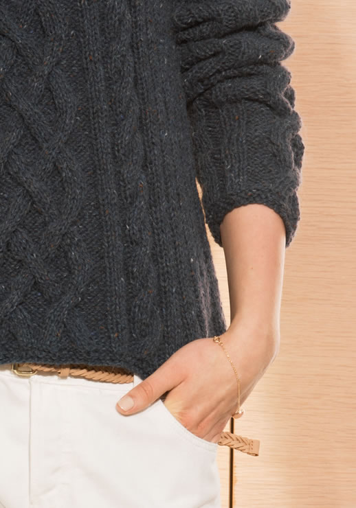 Lavish cables create plenty of interest in this long-sleeve pullover. The matching cowl adds panache and warmth.