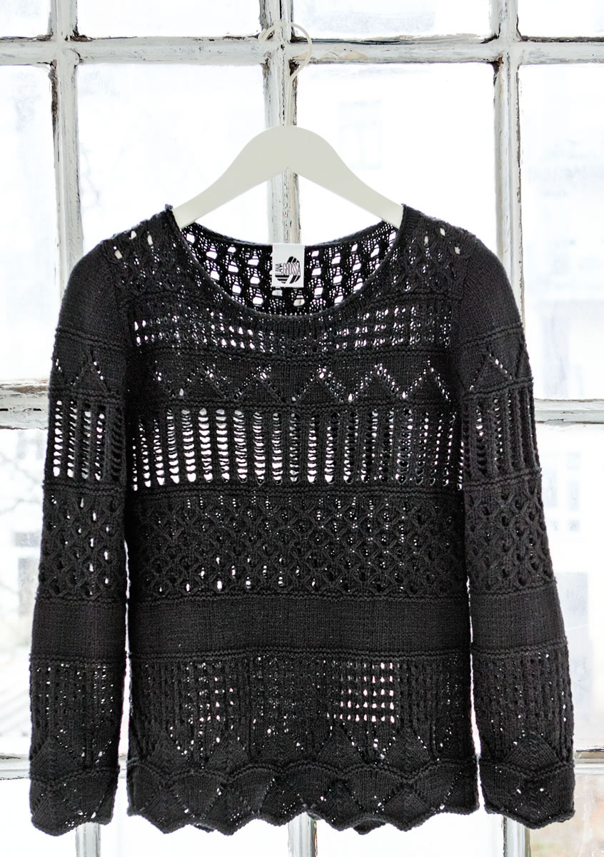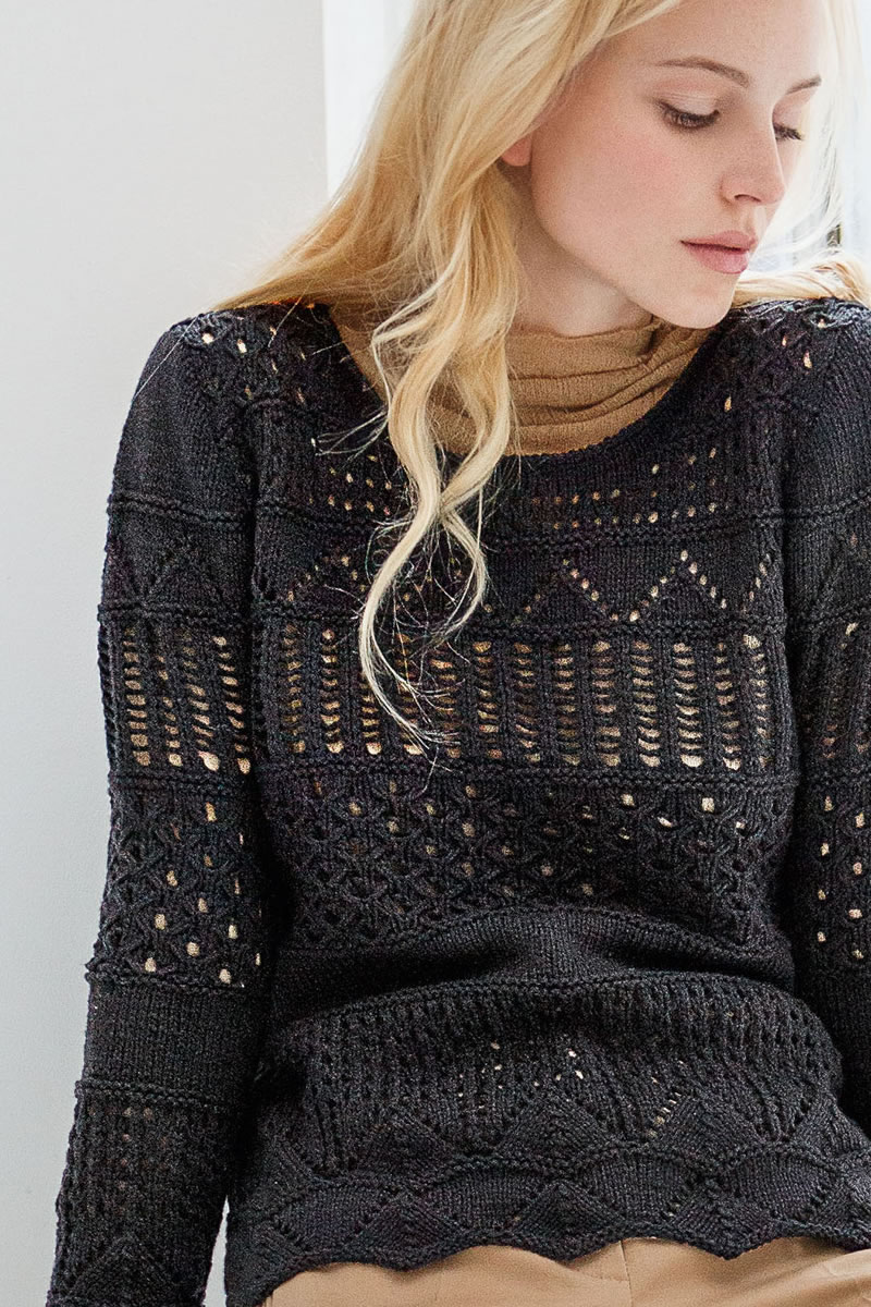 350 (350, 400) g of Lana Grossa 365 Cashmere (77% cotton, 15% cashmere, 8% polyamide; 175 m/50 g) in Black (col 12). Size 4 mm needles; size 4 mm circular needle, 40 cm long; cable needle [cn].