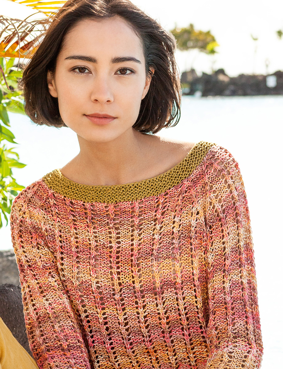 300 (350) g of Lana Grossa A Mano (100% organic cotton; 110 m/50 g) in Pale-/Sun Yellow/Orange/Red- Brown/Rosewood (col 4) and 50 (100) g of Lana Grossa About Berlin Chilly (100% linen; 95 m/50 g) in Olive (col 2). Size 5.5 mm circular needles, 60, 80 and 100 cm long; size 5 mm circular needle, 60 cm long