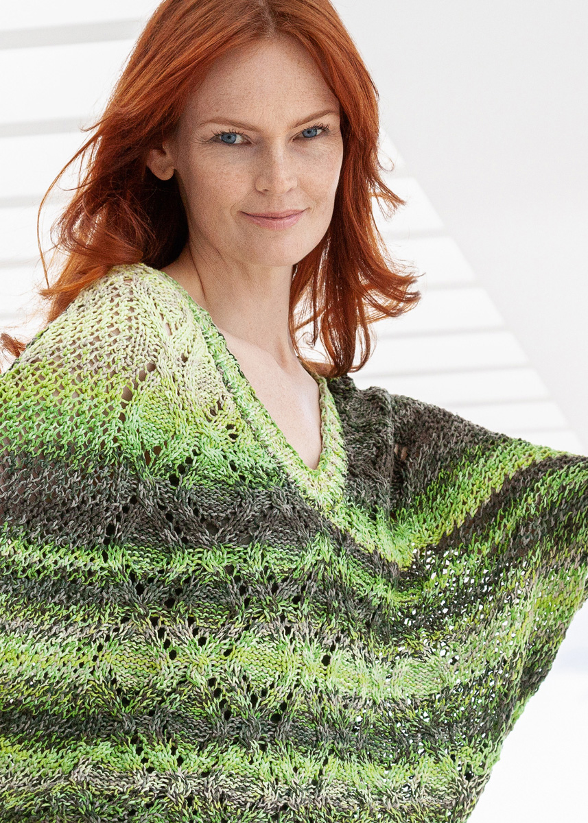 350 (400) g of Lana Grossa A Mano (100% organic cotton; 110 m/50 g) in Light-/Dark Green/Pale Yellow/ Grey-/Yellow Green (col 3). Size 4.5 mm needles; size 4.5 and 5 mm circular needles, each 80 cm long; cable needle [cn]; size 4 mm crochet hook