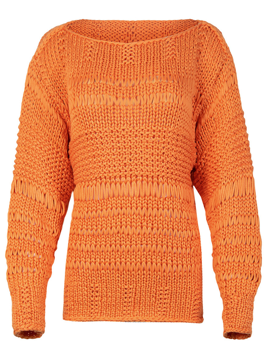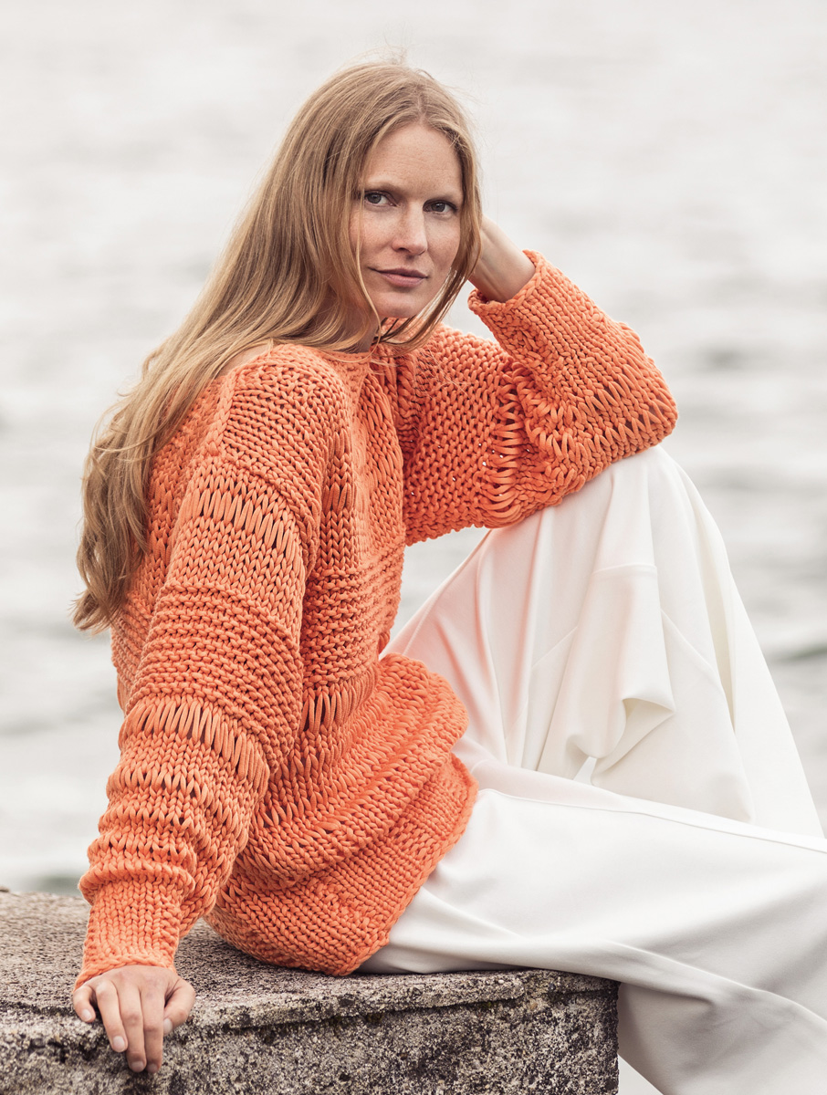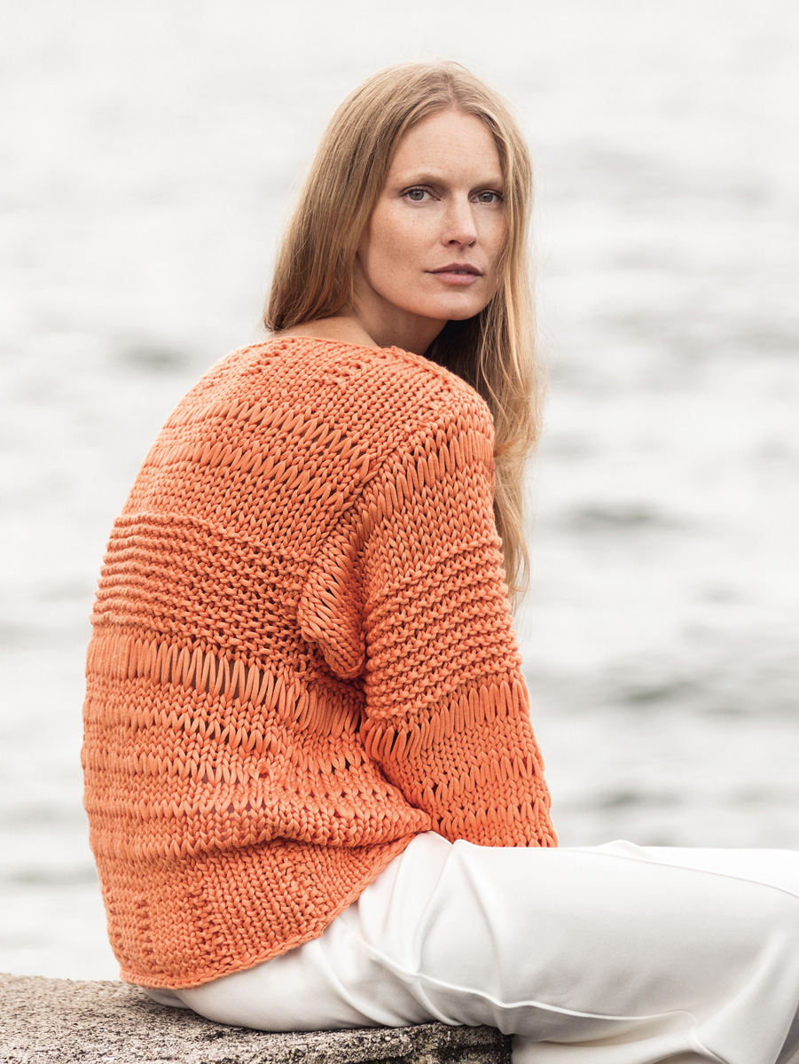 600 (650, 700) g of Lana Grossa About Berlin Bulky (50% cotton, 50% Micromodal; 47 m/50 g) in Mandarine (col 2). Size 8 and 9 mm needles; size 7 mm crochet hook