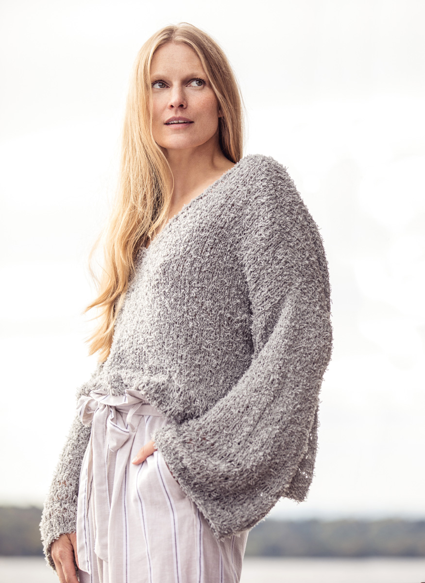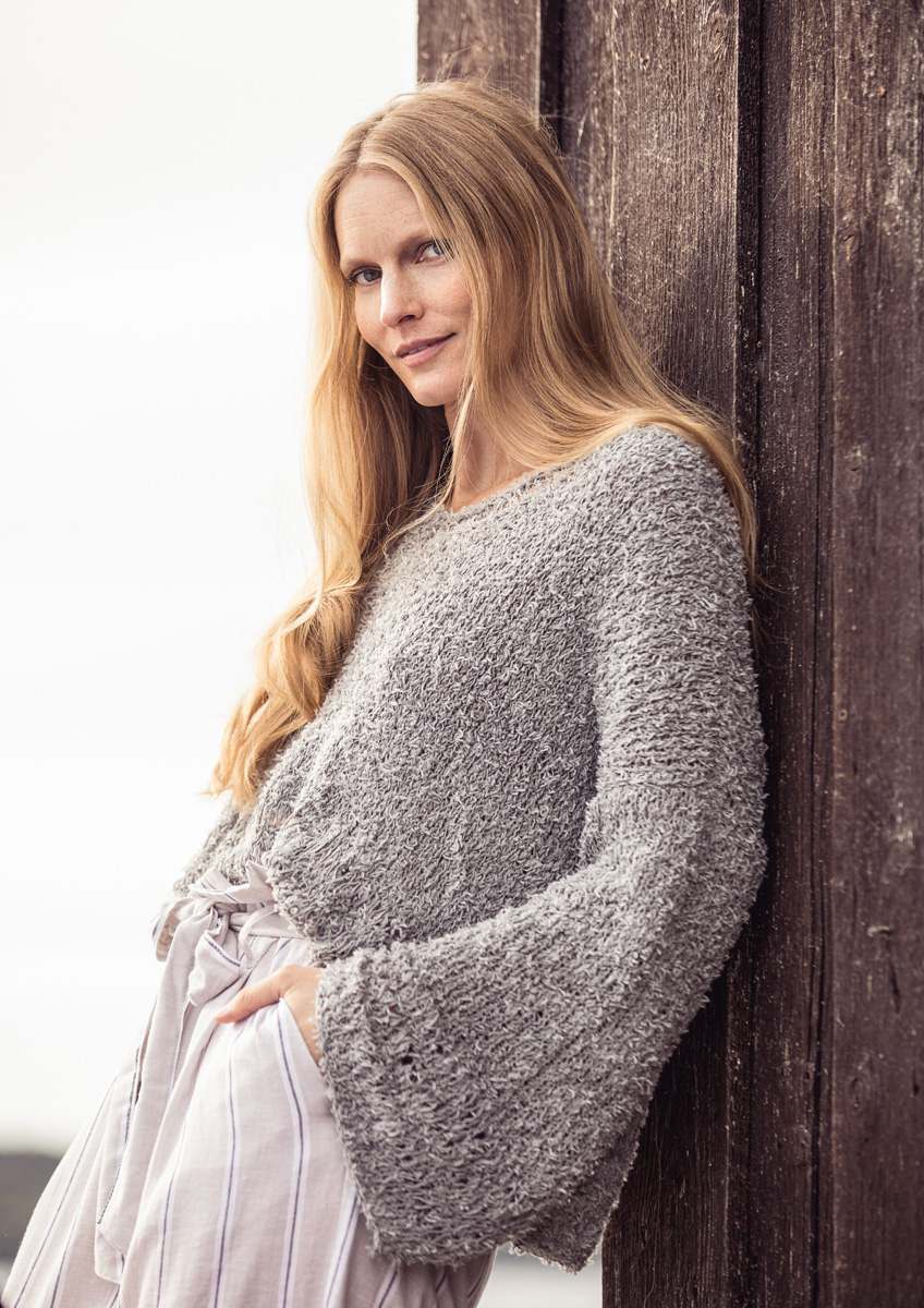 300 (350, 400) g of Lana Grossa About Berlin Funky (83% cotton, 17% polyamide; 115 m/50 g) in Grey (col 4). Size 5.5 mm needles; size 5 mm circular needle, 40 cm long