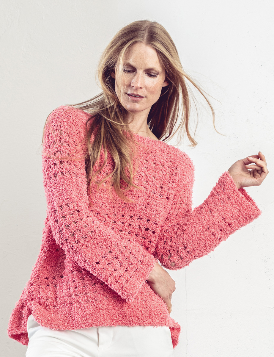 350 (400, 450) g of Lana Grossa About Berlin Funky (83% cotton, 17% polyamide; 115 m/50 g) in Bonbon (col 8). Size 5 mm needles; size 4.5 mm crochet hook