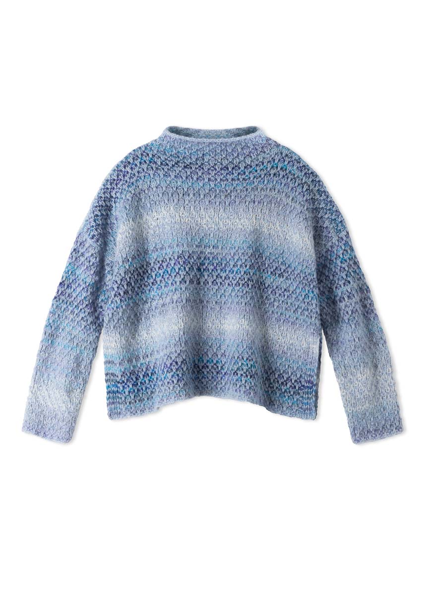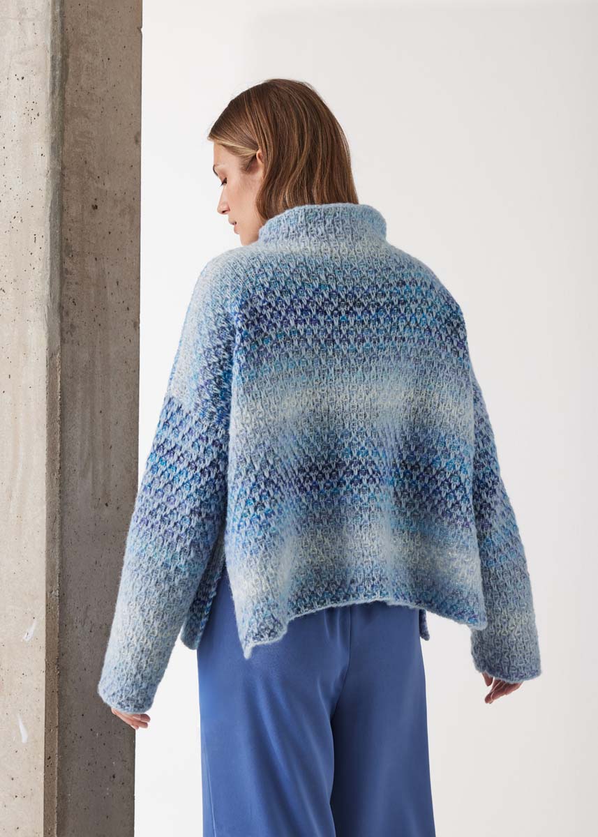 Lana Grossa Airy (42 % Alpaca, 40 % Cotton, 18 % Virgin wool Merino, approx. 170 m/50 g), 200 (250 - 300) g pastel blue (col 21) and Lana Grossa Picasso (36 % Alpaca, 36 % Virgin wool Merino, 28 % Polyamide, approx. 210 m/50 g), 150 (200 - 200) g white/light blue/gray blue/jeans/sky blue/dark blue (col 13); knitting needles size 6 mm; 1 circular knitting needle size 6 mm, 50 cm long; 2 double pointed needles (for putting sts on hold)