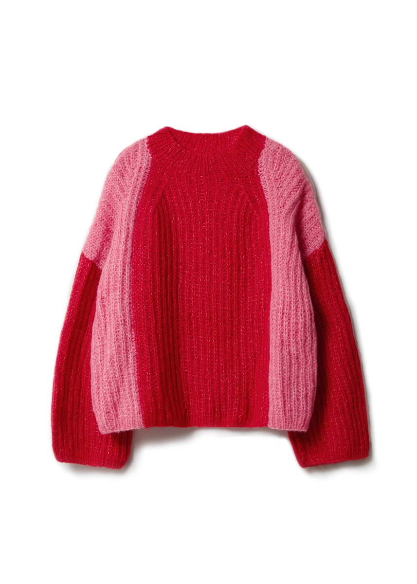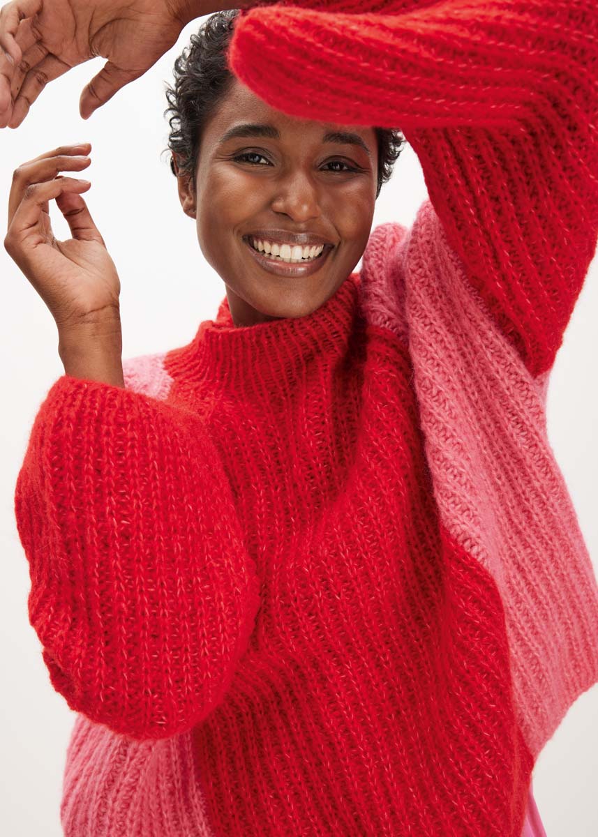 250 (300, 350) g of Lana Grossa Alpaca Air (62% baby alpaca, 27% polyamide, 11% fine Merino wool,; 140 m/ 50 g) in Red (col 9) and 150 (150, 200) g in Pink (col 7). Size 5 mm needles; size 5 mm circular needle, 50 cm long.