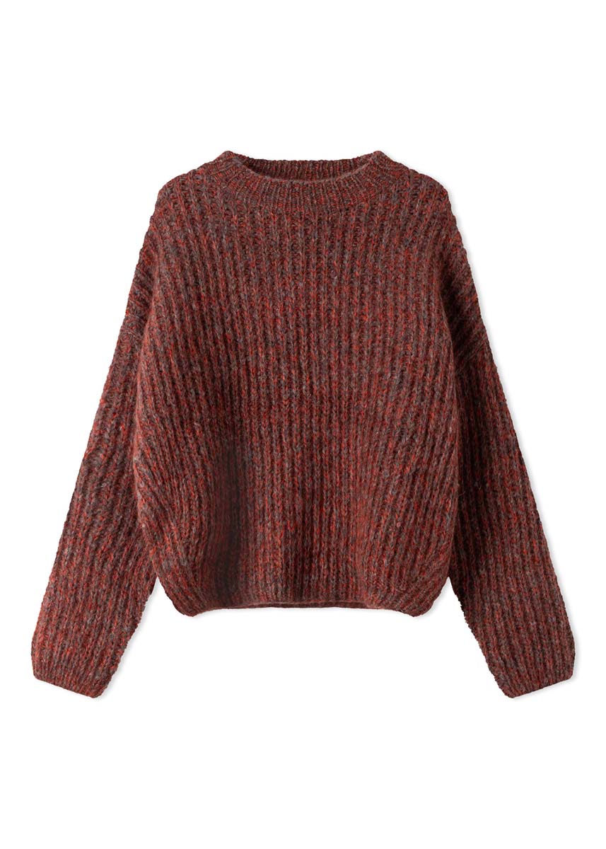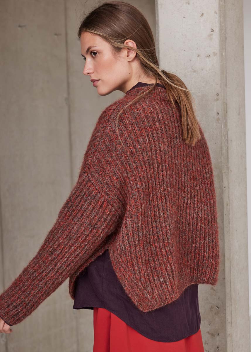Lana Grossa Alpaca Air II (50 % Alpaca, 27 % Polyamide, 14 % Cotton, 9 % Virgin wool Merino, approx. 140 m/50 g), 300 (300 - 350) g gray brown (col 32) und Lana Grossa Silkhair (70 % Mohair, 30 % Silk, approx. 210 m/25 g), 125 (125 - 150) g luminous red (col 215); knitting needles size 4,5 mm; 1 circular knitting needle size 4,5 mm, 45 cm long