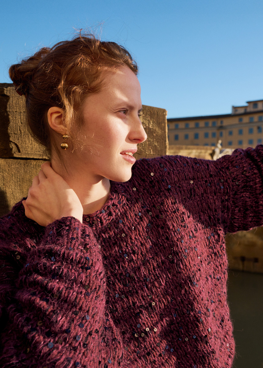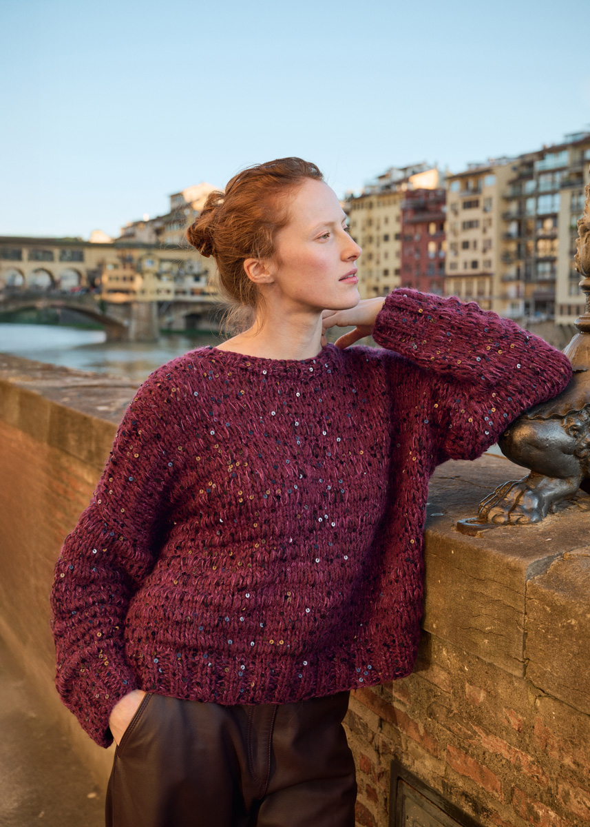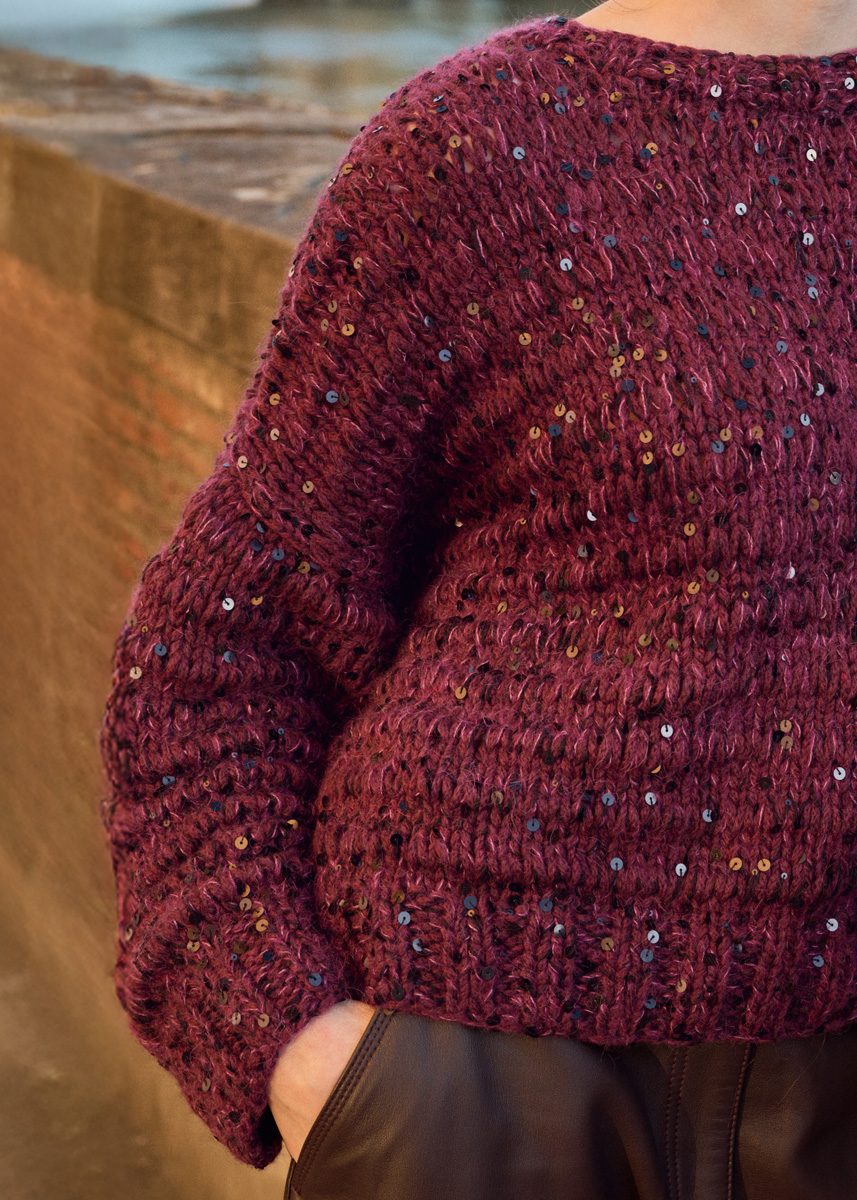 350 (350, 400, 400) g of Lana Grossa Alta Moda Cashmere 16 (78% Merino wool, 12% cashmere, 10% polyamide; 110 m/50 g) in Burgundy (col 27); 75 (100, 100, 100) g of Lana Grossa Setasuri (69% Suri alpaca, 31% silk; 212 m/25 g) in Bordeaux (col 31); 200 (200, 300, 300) g of Lana Grossa Cosmo (100% cotton (with sequins); 260 m/100 g) in Black (col 5). Size 9 mm needles; short size 9 mm circular needle.