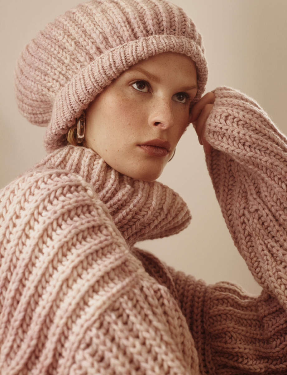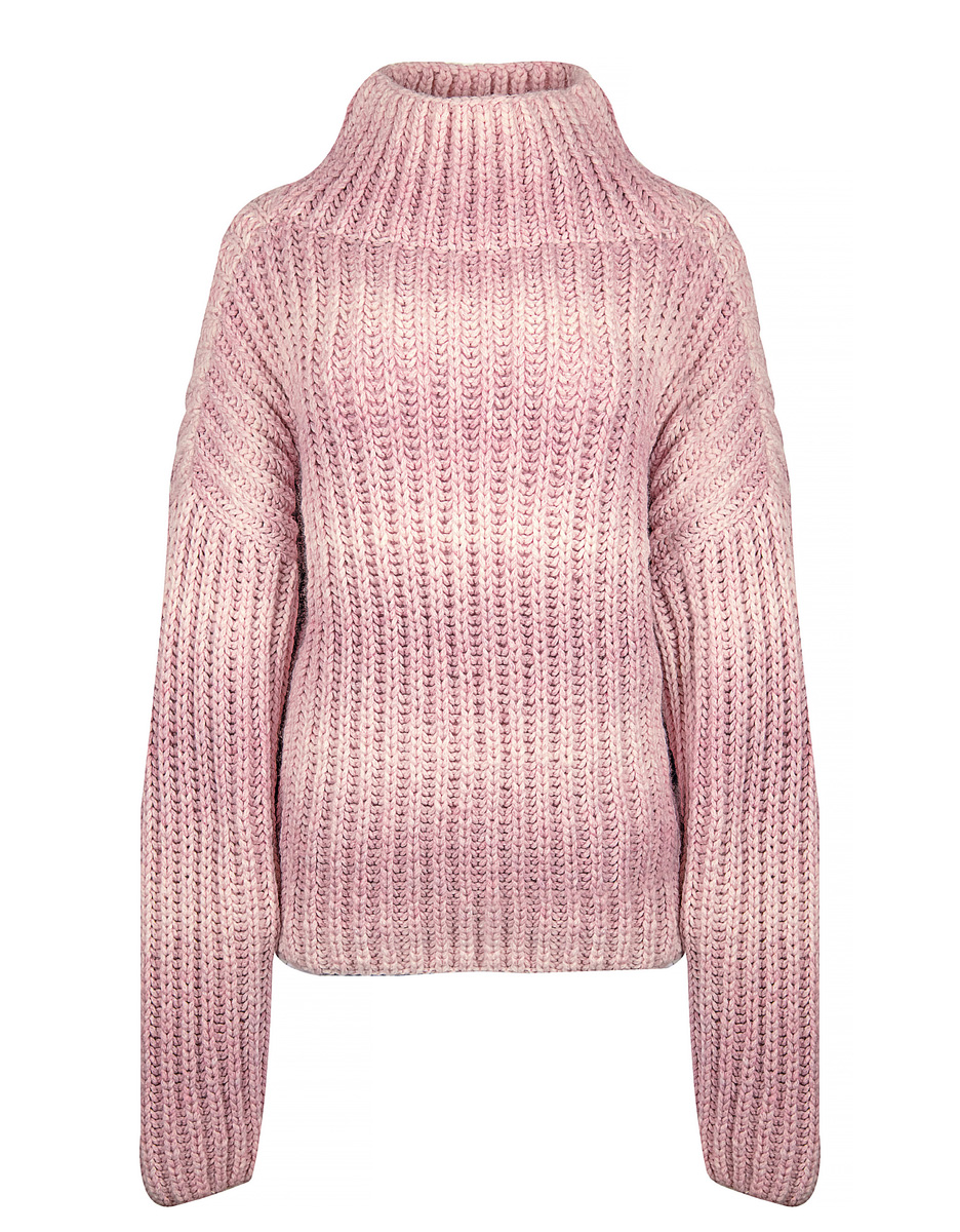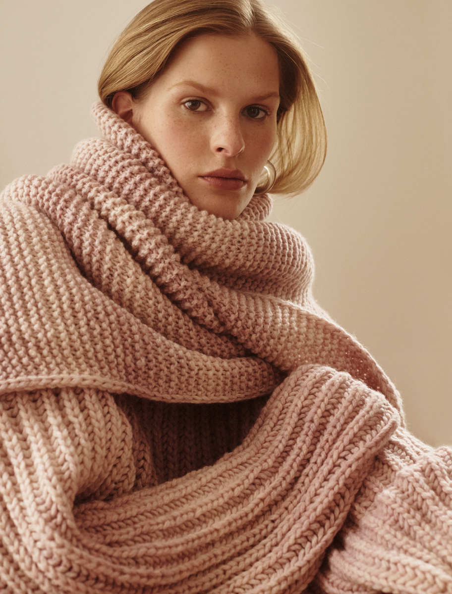 700 (800) g of Lana Grossa Alta Moda Cashmere 16 Sfumato (78% Merino wool, 12% cashmere, 10% polyamide; 220 m/100 g) in Pink Mélange (col 201). Size 8 and 10 mm needles; size 9 mm circular needle, 50 cm long