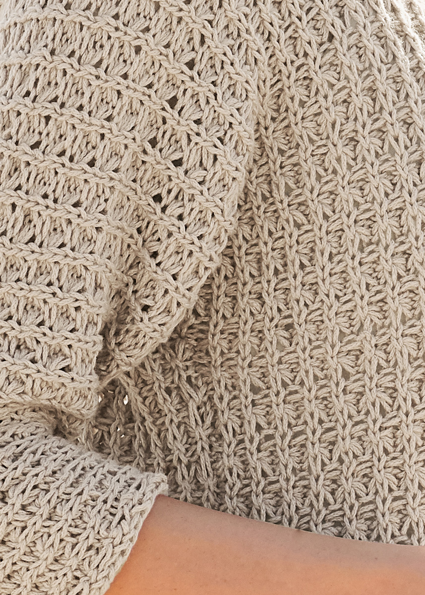 350 (400, 450) g of Lana Grossa Alta Moda Cotolana (45% Merino wool, 45% Pima cotton, 10% polyamide; 150 m/50 g) in Greige (col 8). Size 5.5 mm needles; size 5.5 mm circular needle, 100 cm long; size 4.5 mm circular needle, 40 cm long