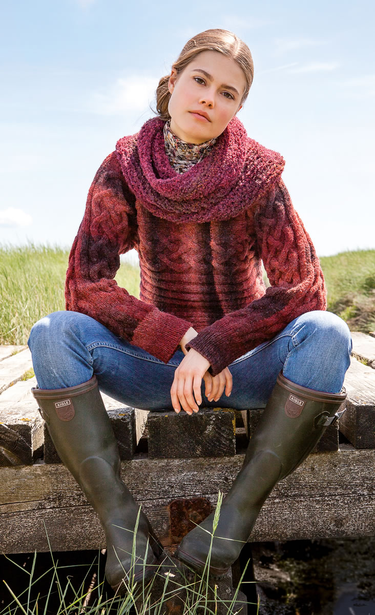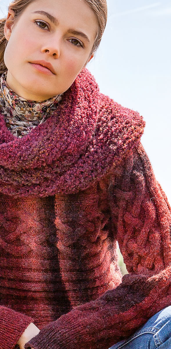 This appealing pullover will give you a stylish start into fall. Worked side to side in a rib and cable pattern that works perfectly with the yarn’s tonal shifts. Add an extra layer of warmth and style with the cowl.