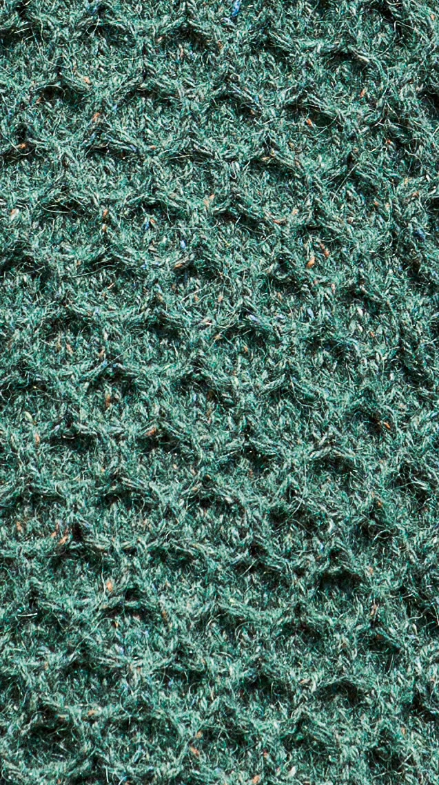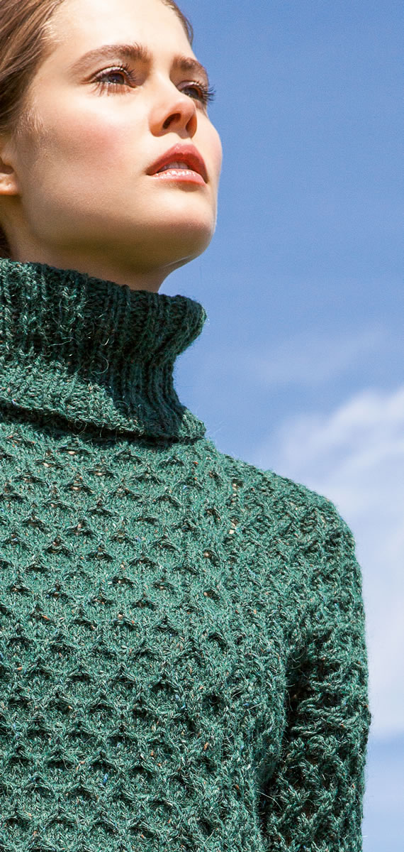 A bottle-green tweed yarn adds retro chic to this turtleneck sweater with its eclectic mix of cable patterns.
