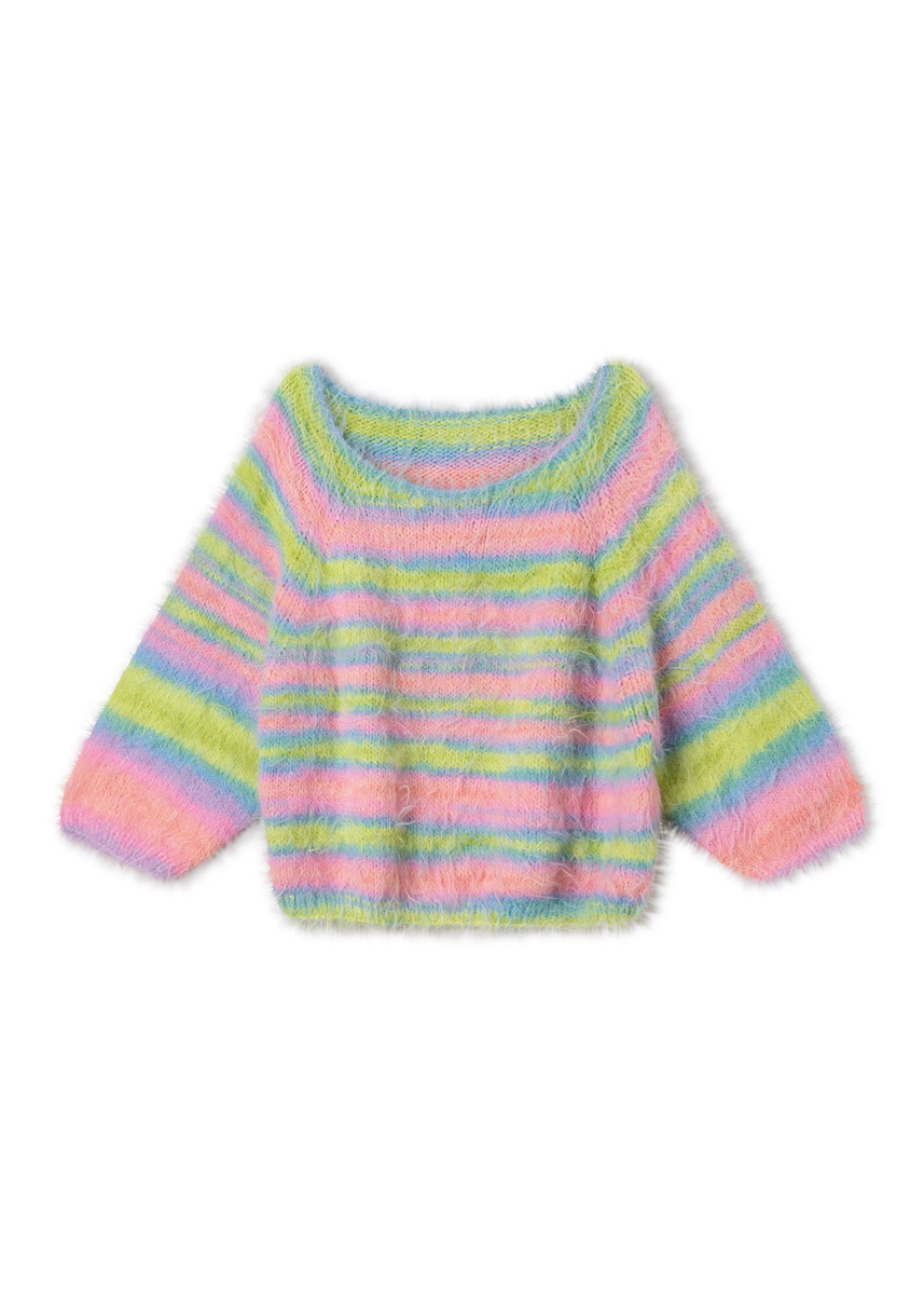 400 (400, 450, 500) g of Lana Grossa Basta Mista (50% Merino wool, 50% polyamide; 100 m/50 g) in Lime/Turquoise/ Aqua/Salmon/Pink/Lilac (col 113) Short and long size 5 and 6 mm circular needles; one set each size 5 and 6 mm double- pointed needles [dpns]; stitch markers; stitch holders.