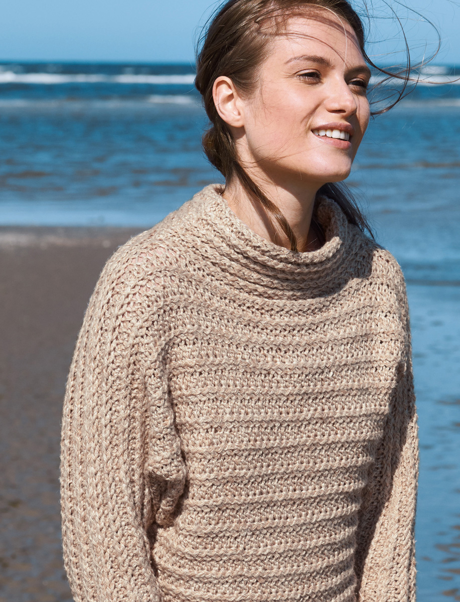 400 (450) g of Lana Grossa Benessere (45% cotton, 32% alpaca, 23% polyamide; 125 m/50 g) in Beige/ Natural (col 3). Size 5 and 6 mm needles; size 5 and 6 mm circular needles, each 60 cm long