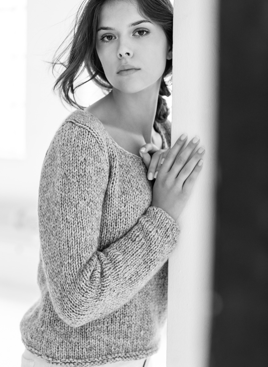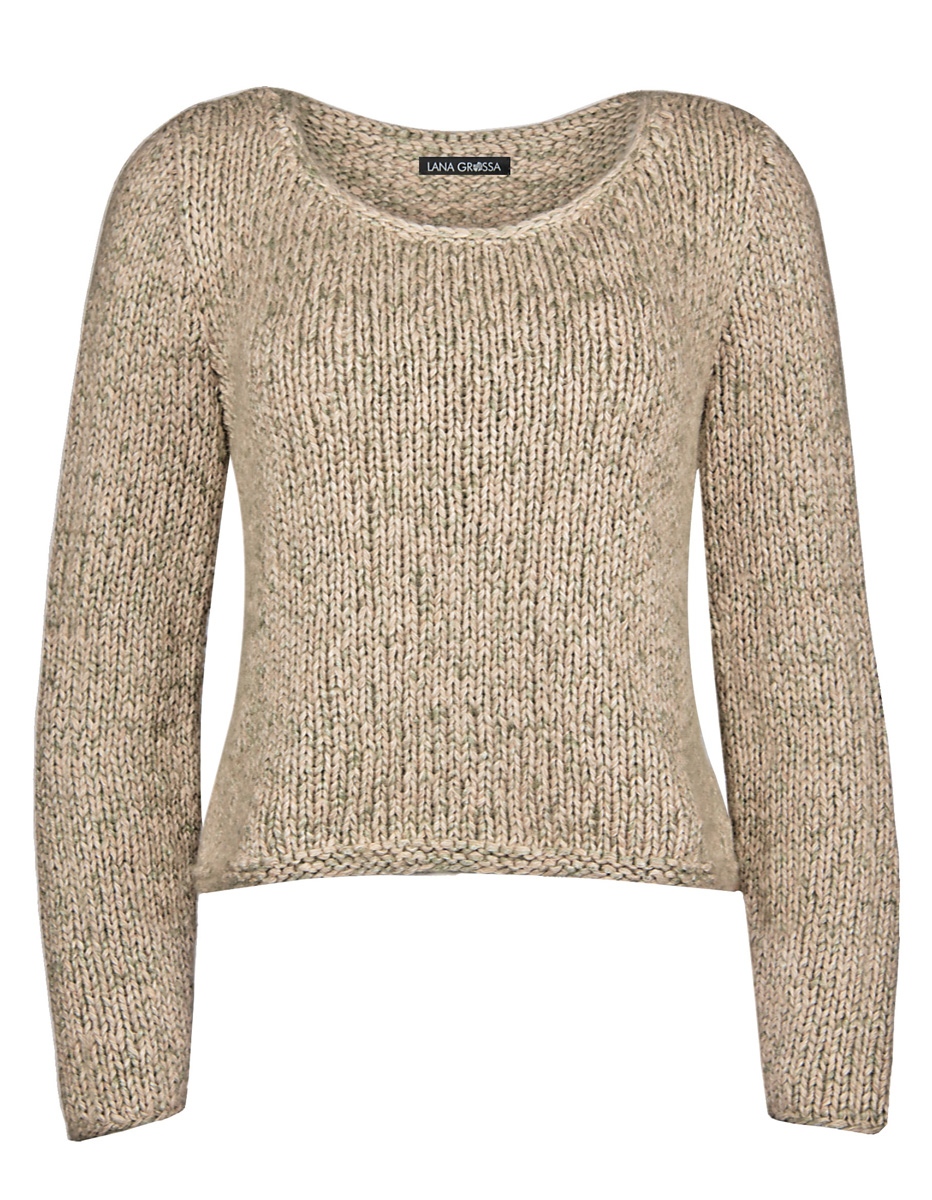 200 (250, 300) g of Lana Grossa Benessere (45% cotton, 32% alpaca, 23% polyamide; 125 m/50 g) in Beige/Natural (col 3) and 200 (225, 250) g of Lana Grossa Mia (30% mohair, 26% pure wool, 25% silk; 19% polyamide; 105 m/25 g) in Green/Grey (col 12). Size 9 mm needles; size 5 mm crochet hook