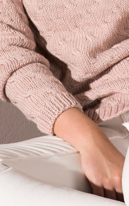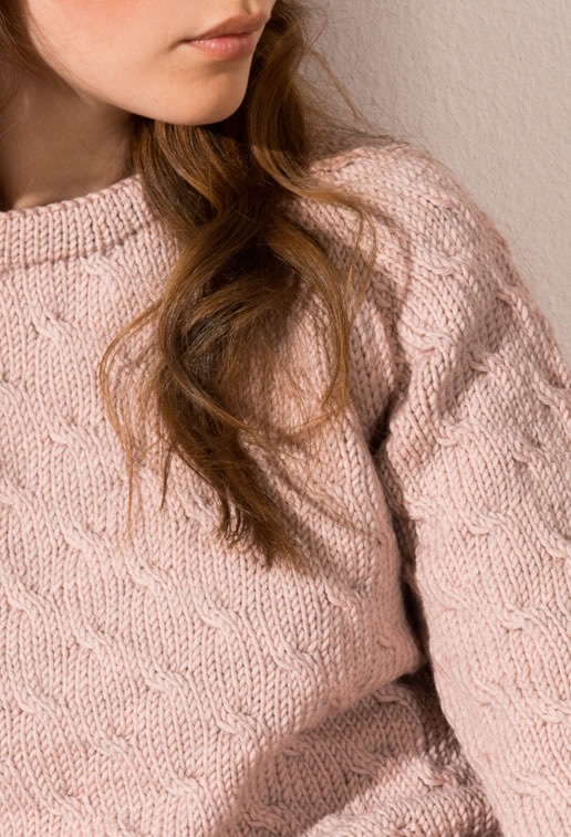 An allover cable pattern and raglan shaping define this sweet and simple pullover. Powder pink provides a wardrobe wake-up.