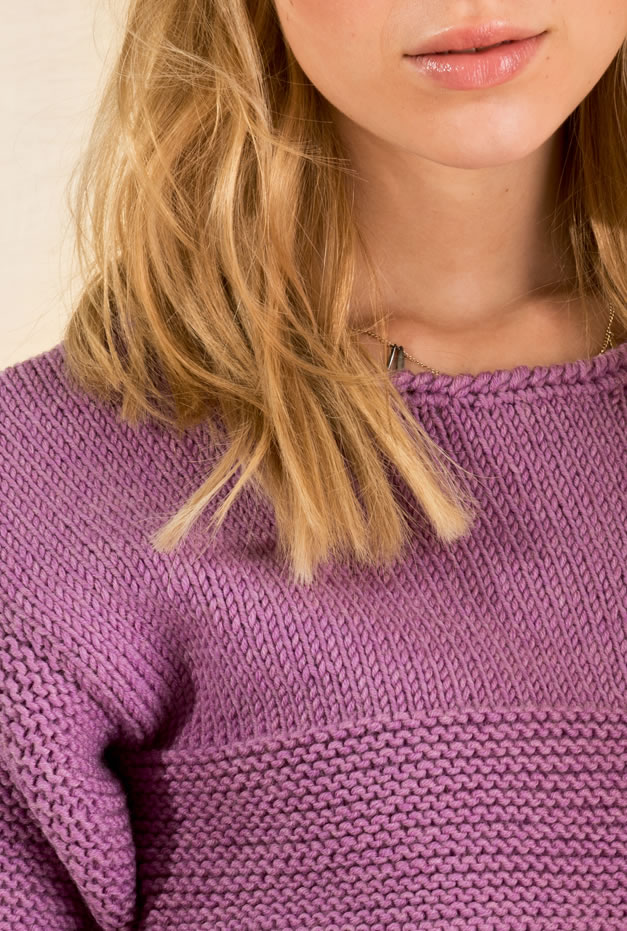 Stockinette and garter stitch play off nicely against each other on this intensely colored pullover. The curved hem at the back gives it a stylish edge.