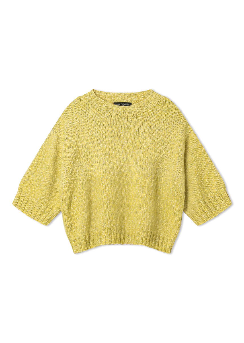 400 (400, 450, 450) g of Lana Grossa Bottoni (53% cotton, 24% viscose, 23% extrafine Merino wool; 125 m/50 g) in Citrus Yellow/Cream (col 19). Size 3.5 and 4.5 mm needles; short size 3 mm circular needle.