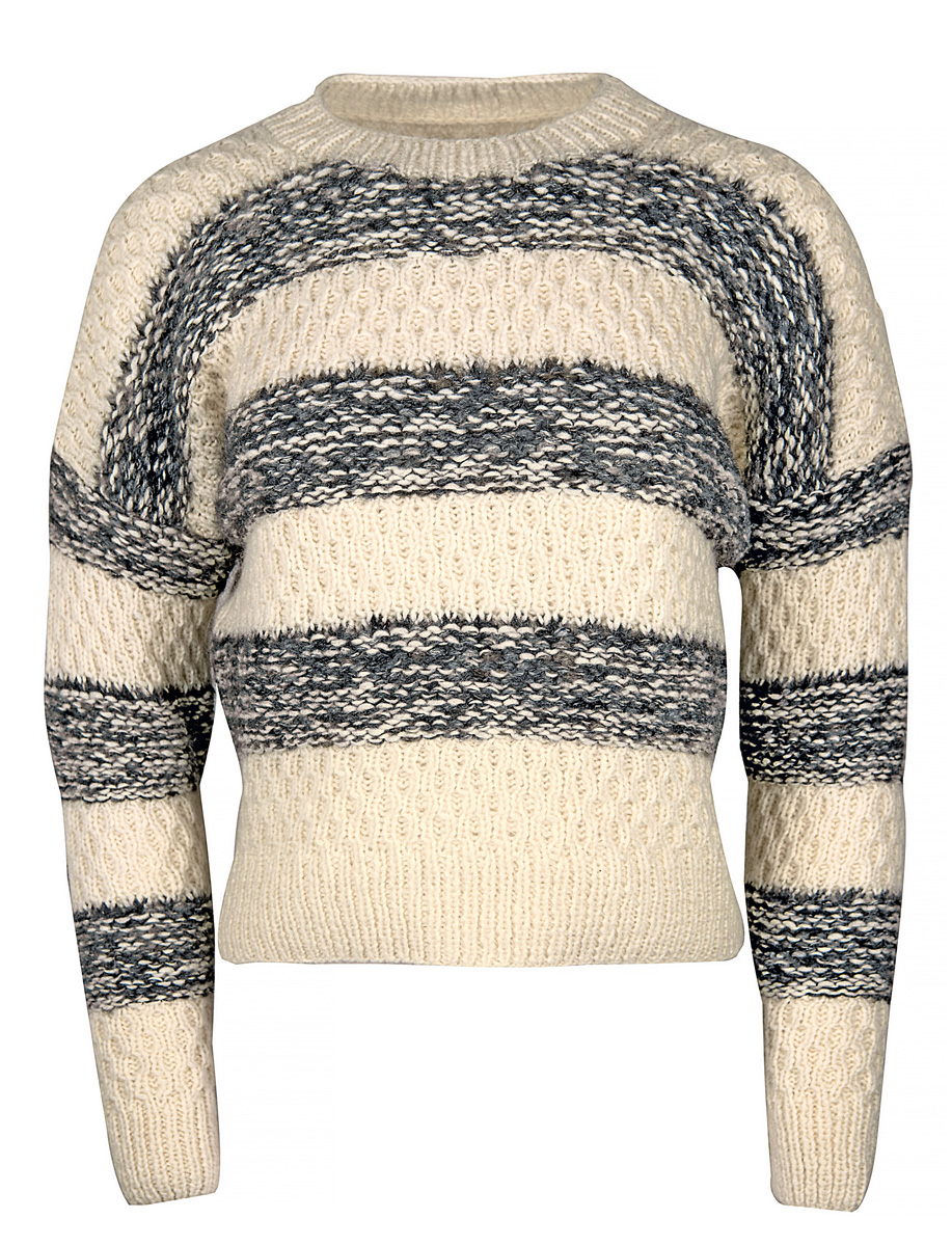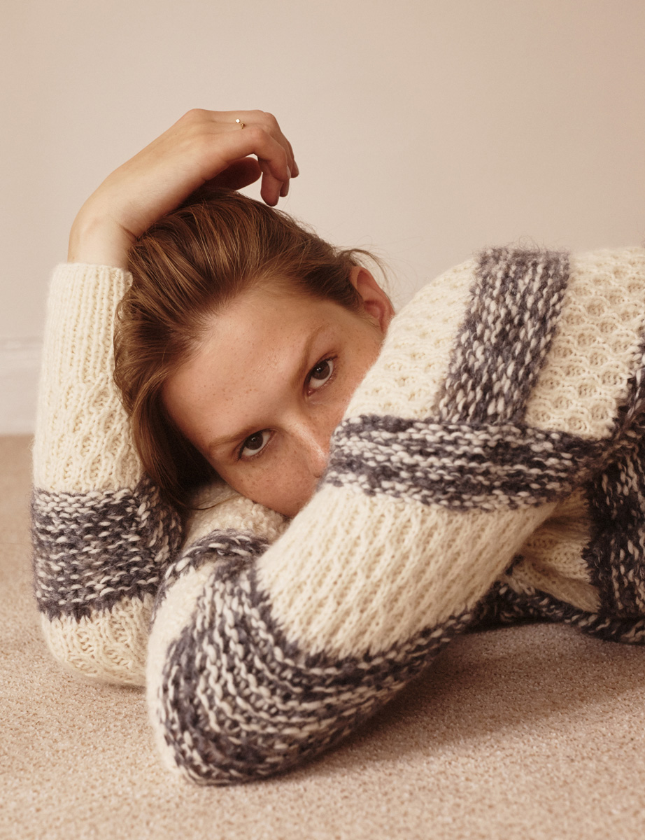 350 (400) g of Lana Grossa Brigitte No. 2 (47% baby alpaca, 45% cotton, 8% Merino wool; 140 m/50 g) in Natural (col 16); 150 (200) g of Lana Grossa Brigitte No. 2 Tweed (41% cotton, 37% pure wool; 22% mohair; 100 m/50 g) in Light Grey/Grey-Brown/Charcoal (col 102). Size 4, 4.5 and 9 mm needles; size 4 mm circular needle 40 cm long