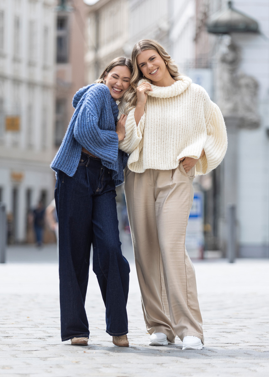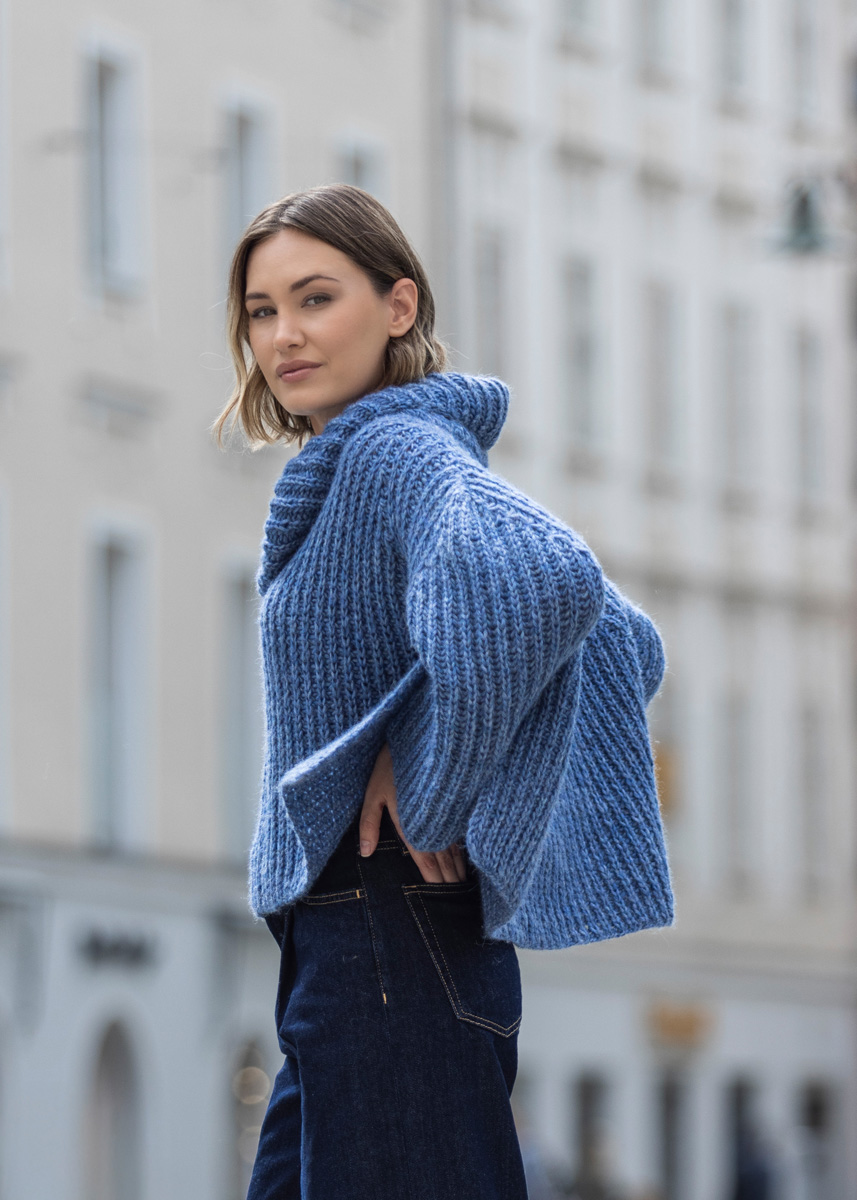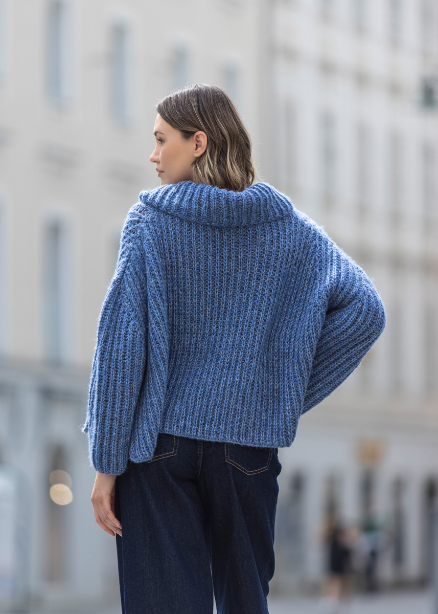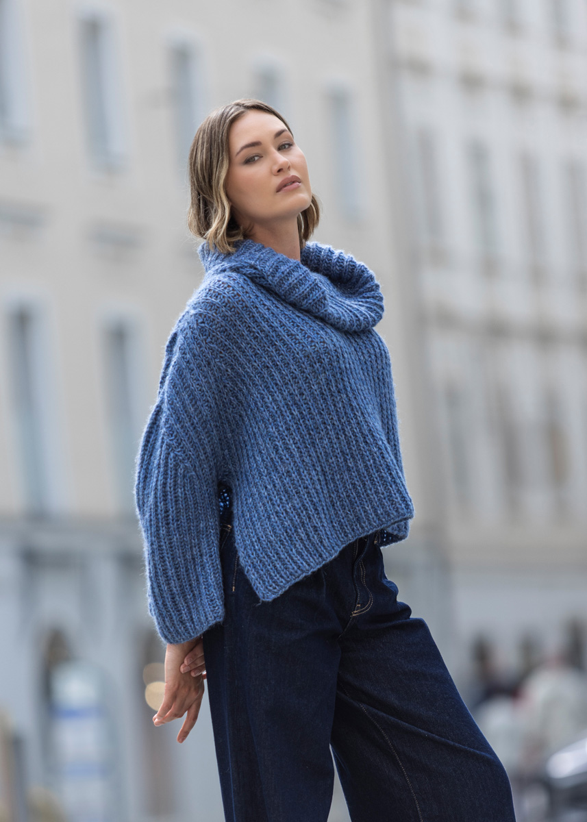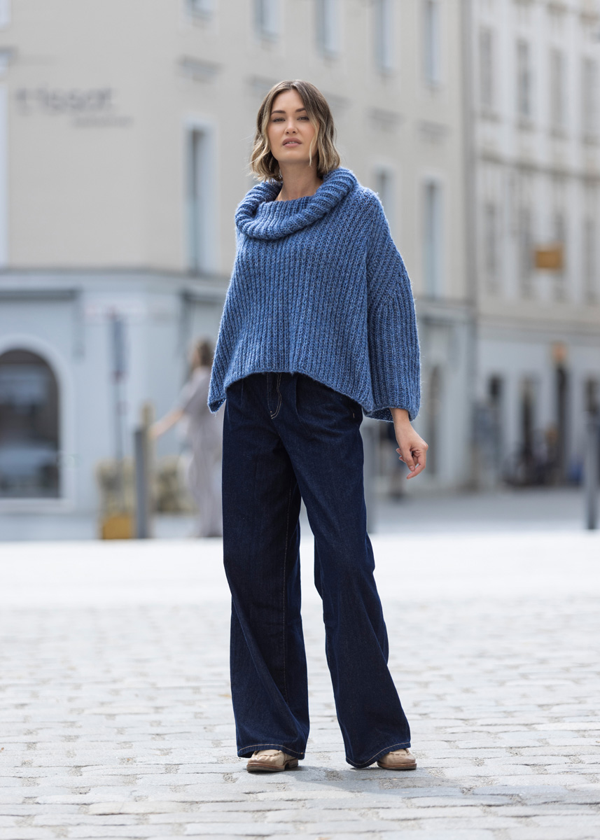The pullover has a total length of 54 (54 - 54 - 57 - 57 - 57) cm and a positive ease of 56 cm at 80 cm bust circumference (52 cm at 88 cm bust circumference - 44 cm at 96 cm bust circumference - 40 cm at 104 cm bust circumference - 32 cm at 116 cm bust circumference - 24 cm at 128 cm bust circumference).