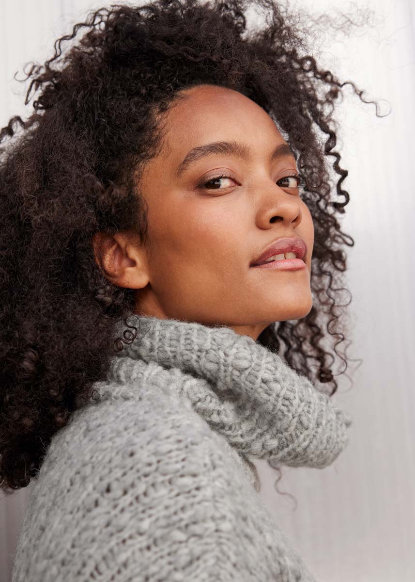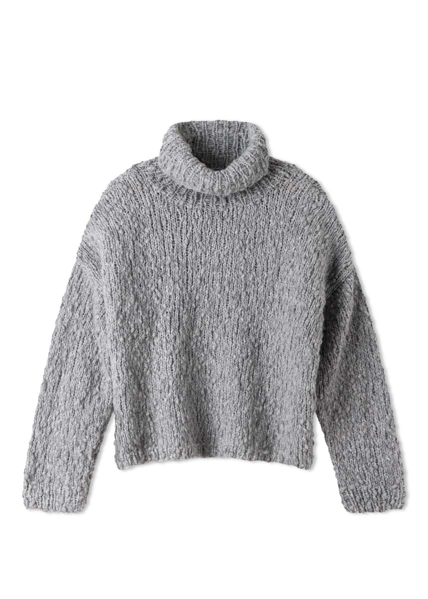 400 (450, 500, 550) g of Lana Grossa Caramella (53% Merino wool, 25% baby alpaca, 22% polyamide; 110 m/50 g) in Light Grey (col 12). Size 7 and 8 mm needles; size 7 mm circular needle, 50 cm long.