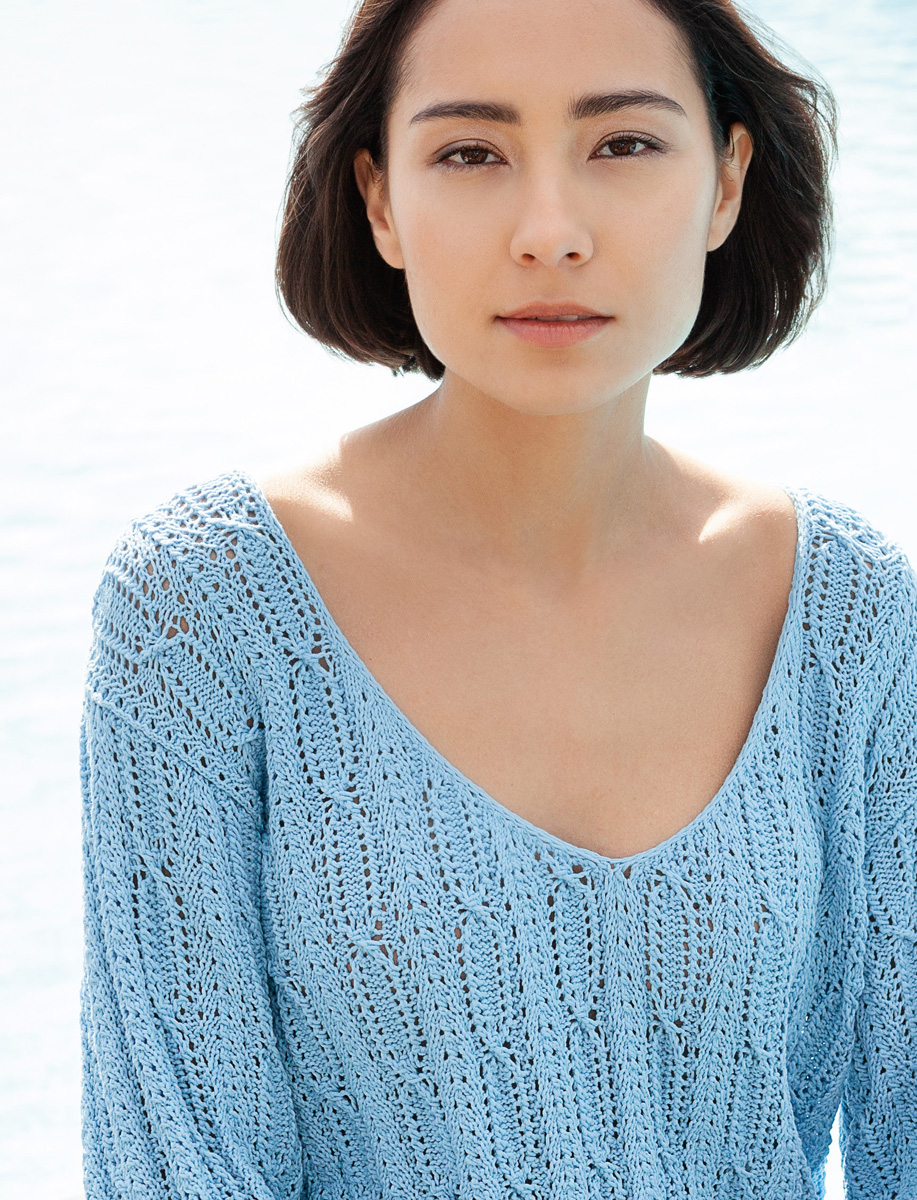 400 g of Lana Grossa Cashair (60% cotton, 30% nylon, 10% cashmere; 225 m/50 g) in Light Blue (col 19). Size 3 and 3.5 mm needles; cable needle [cn]; size 3 mm crochet hook