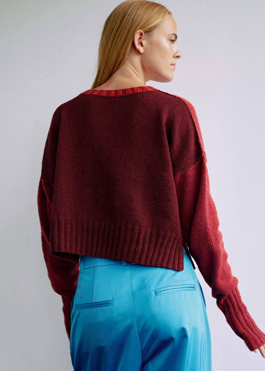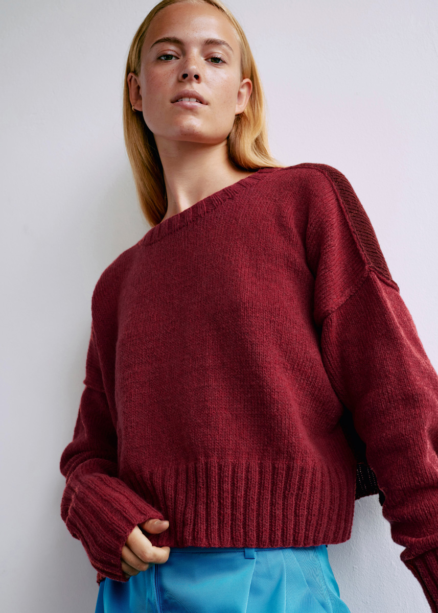 Lana Grossa quality “Cashmere 16 Fine” (80% virgin wool (Merino), 10% cashmere, 10% polyamide, running length = approx. 320 m/50 g): approx. 200 (200 - 250 - 250) g red (color 22), approx. 100 (100 - 150 - 150) g dark red (color 11); knitting needles no. 3.5 and 4.5; 1 short circular knitting needle no. 3.5.