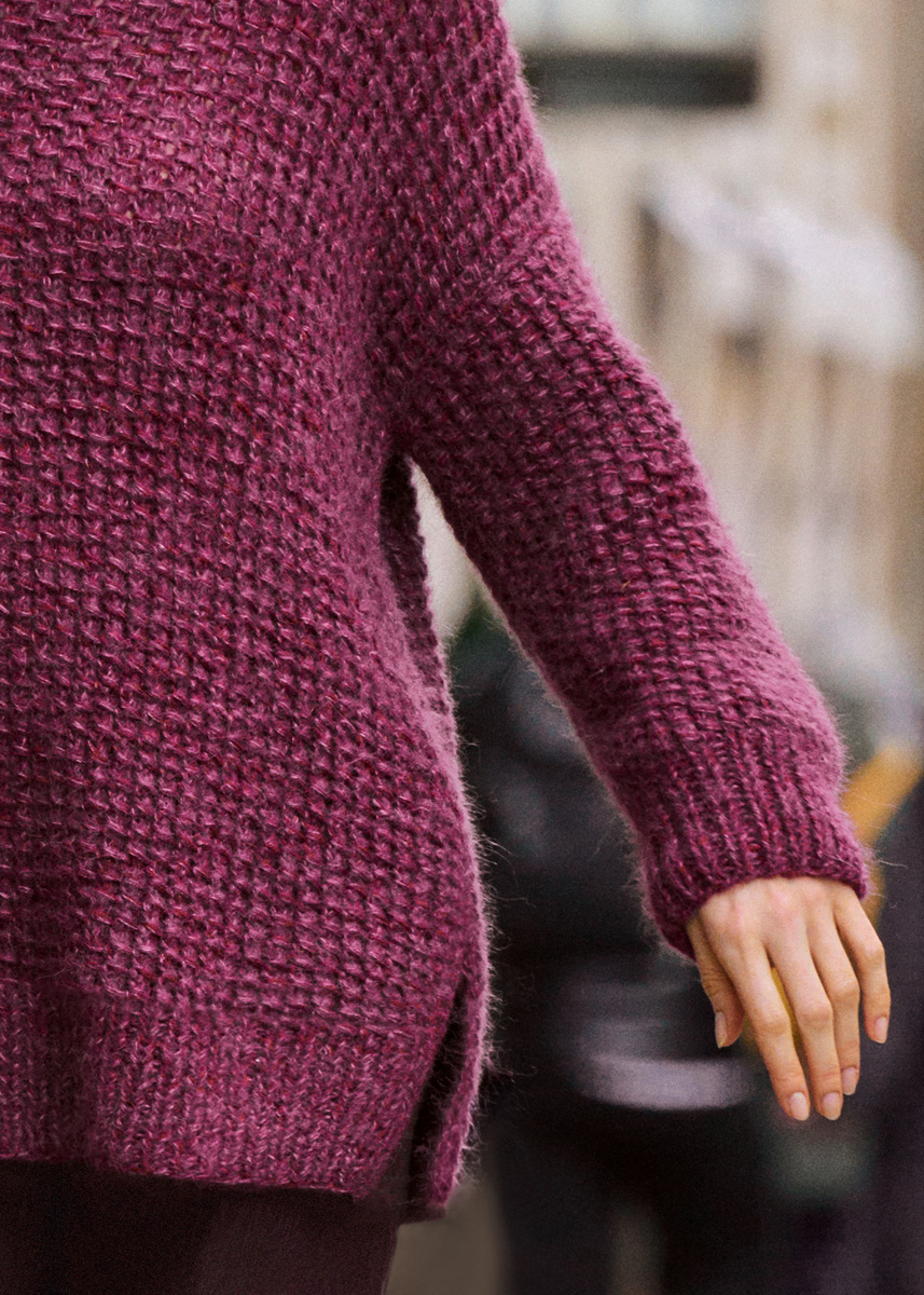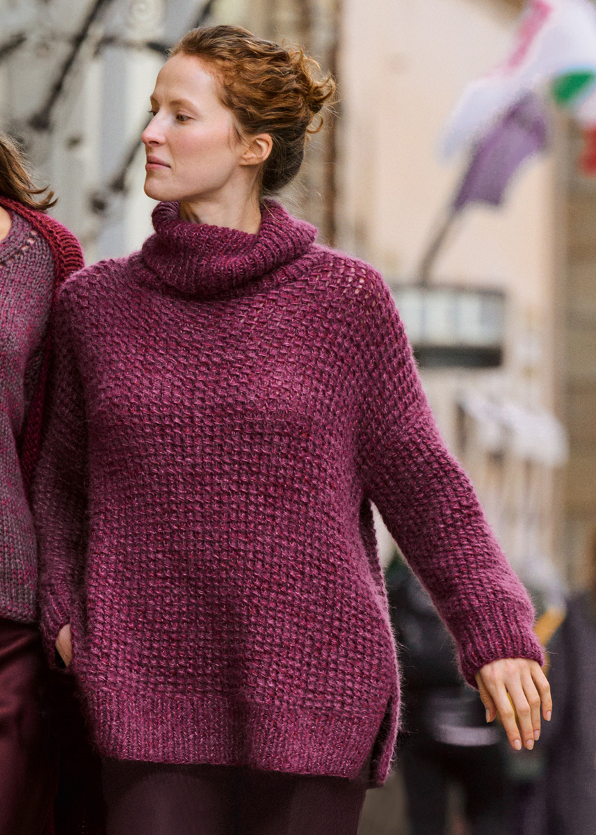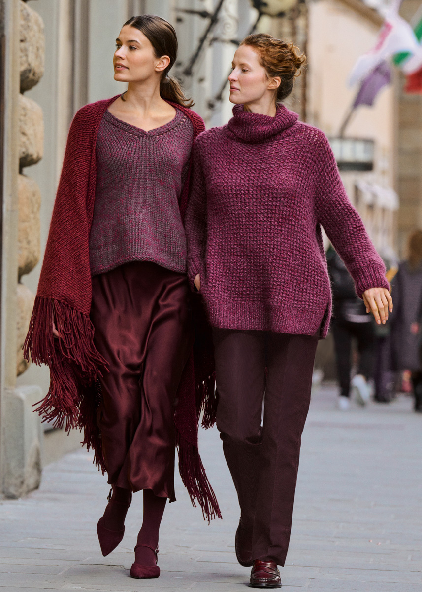 100 (150, 150, 150) g of Lana Grossa Cashmere 16 Fine (80% Merino wool, 10% cashmere, 10% polyamide; 320 m/50 g) in Burgundy (col 58); 125 (150, 175, 200) g of Lana Grossa Setasuri (69% Suri alpaca, 31% silk; 212 m/25 g) in Bordeaux (col 31). Size 7 and 8 mm needles; short size 7 mm circular needle.