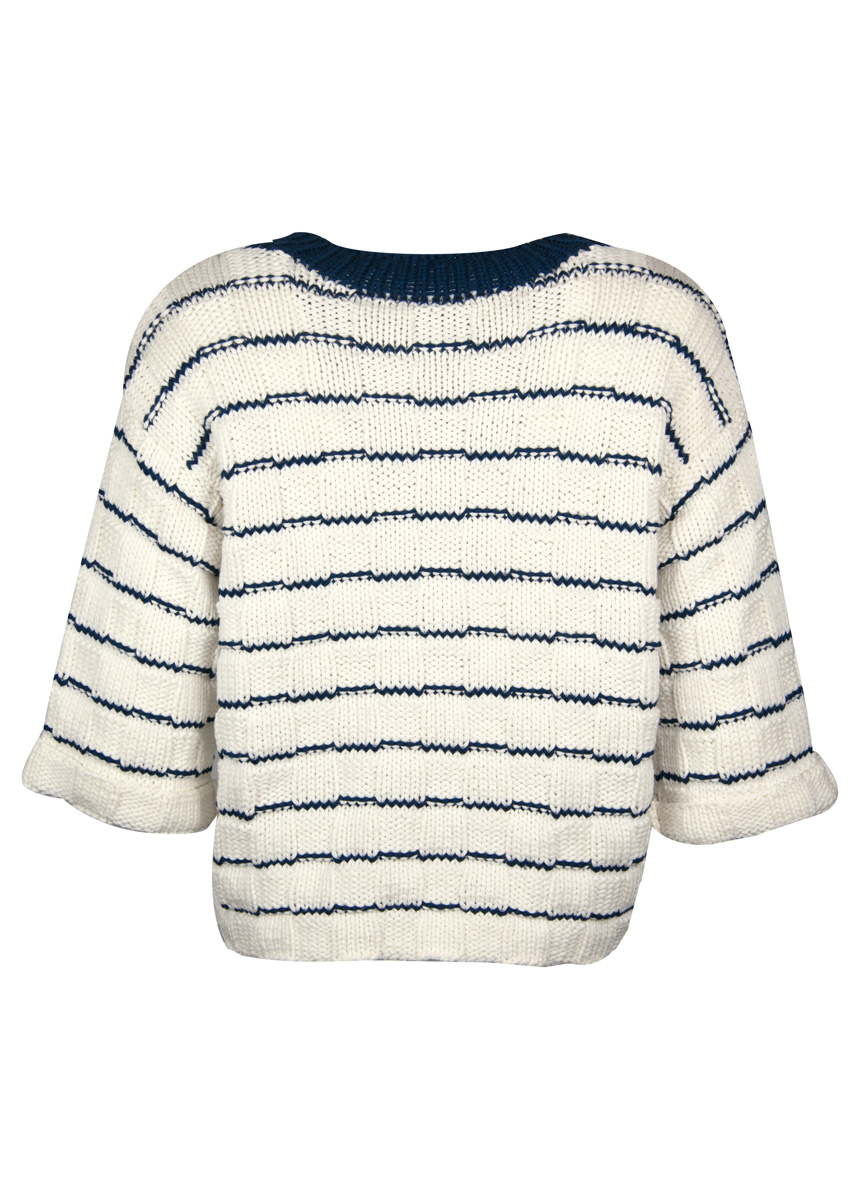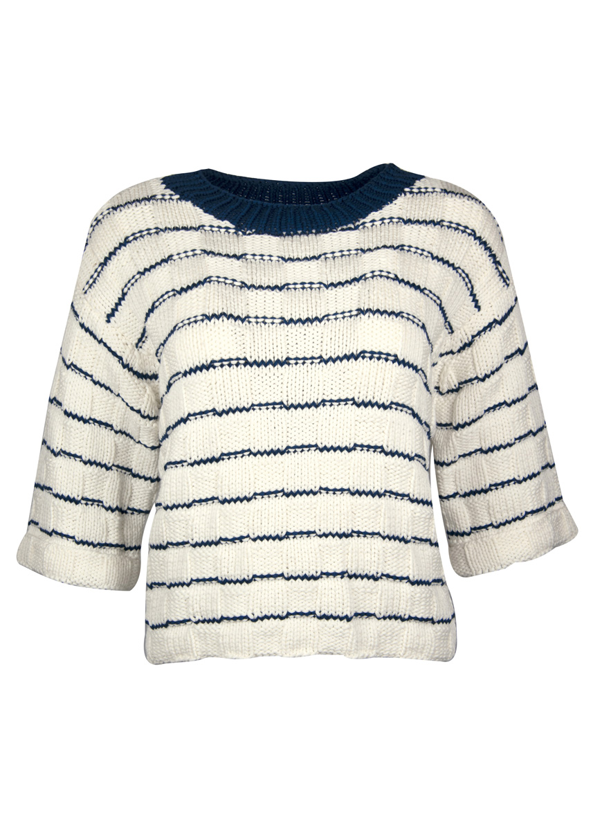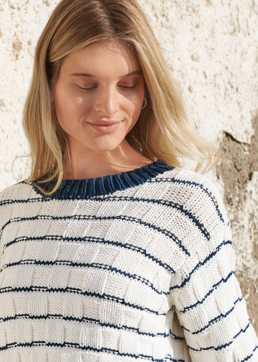450 (500) g of Lana Grossa Cashseta (40% Modal, 30% polyamide; 15% cashmere, 15% silk; 100 m/50 g) in Natural (col 8) and 100 g in Midnight (col 13). Size 7 and 8 mm circular needles, each 80 cm long; size 7 mm circular needle, 50 cm long