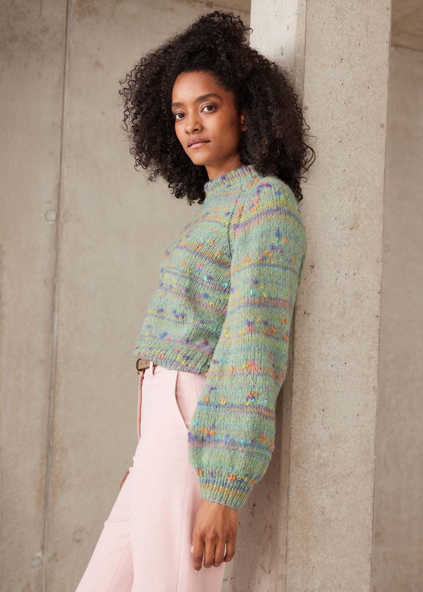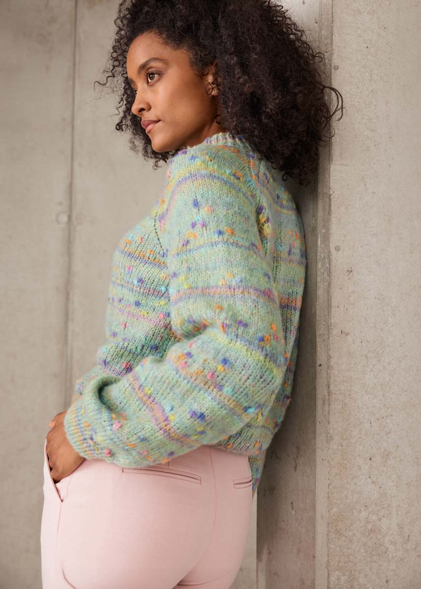 Lana Grossa Cassata (54 % Virgin wool Merino, 30 % Polyamide, 16 % Cotton, 175 m/50 g), 250 (250 - 300) g subtle green/light orange/rose/light gray/purple (col 11); knitting needles size 43 mm and 5 mm; 1 circular knitting needle size 3 mm, 50 cm long